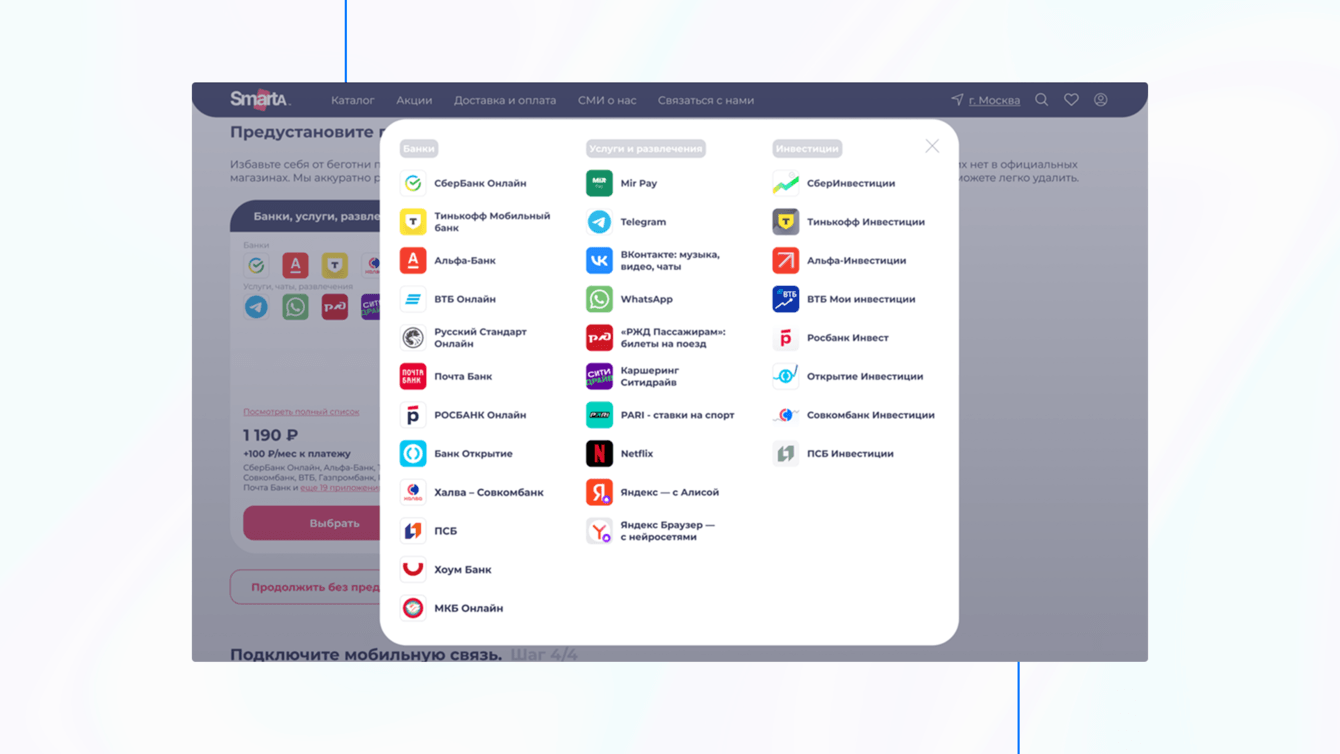 Для увеличения ценности покупки была реализована допродажа в виде пакетов предустановленных приложений. Пользователи получили возможность расширить функционал устройства сразу при покупке, без необходимости скачивать приложения отдельно.