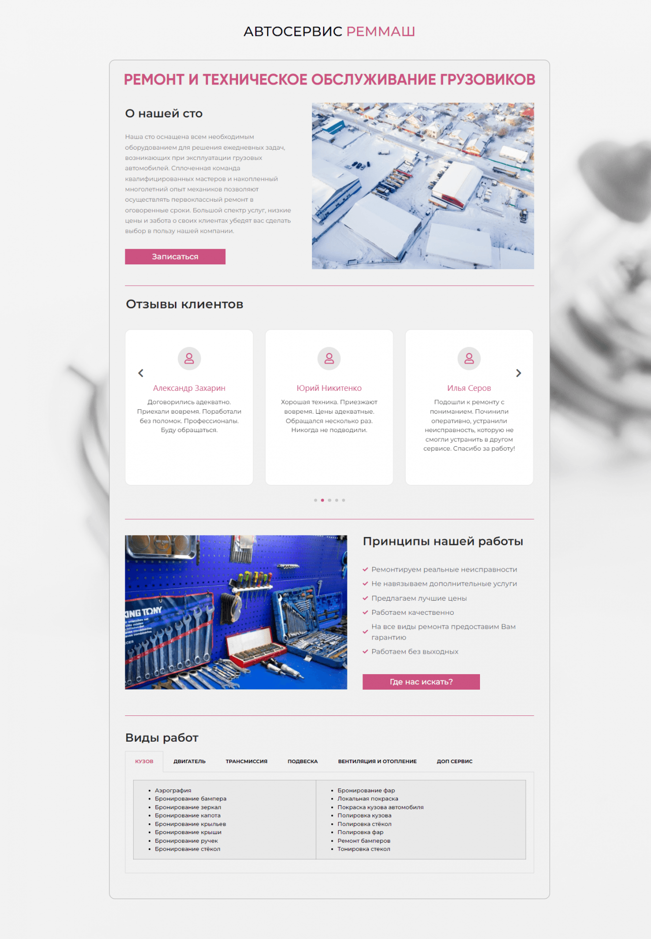 Сайт также включает страницу с информацией о СТО организации, где представлены услуги, отзывы клиентов и перечень оказываемых услуг в виде интерактивной таблицы, что позволяет потенциальным клиентам ознакомиться с возможностями и надежностью сервиса.