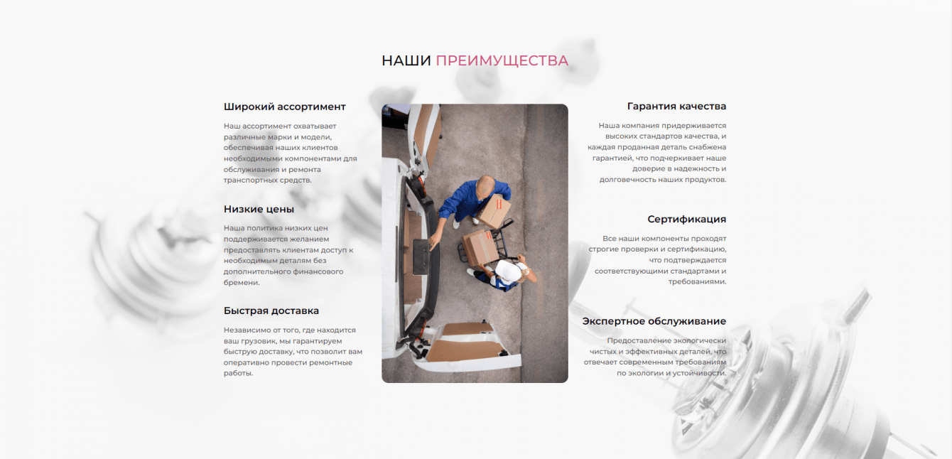 На странице "Каталог" разработан удобный и интуитивно понятный интерфейс для поиска и фильтрации запчастей по категориям, маркам и моделям грузовиков, что позволяет пользователям быстро находить нужные товары. Реализована система подробных описаний и изображений каждой запчасти для облегчения процесса выбора.