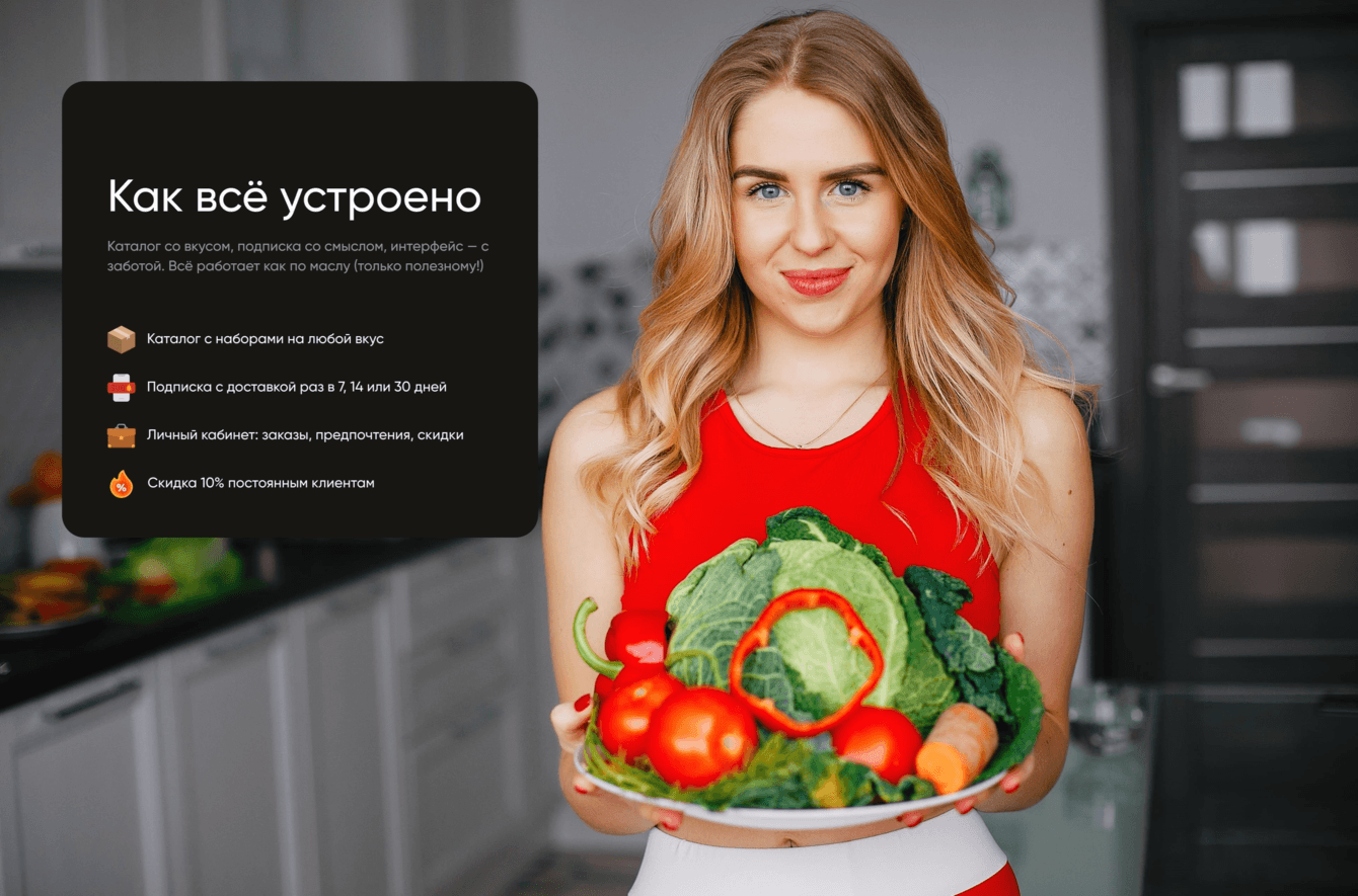 Для создания такого решения мы начали с глубокого анализа ниши: изучили целевую аудиторию, модели поведения и мотивацию покупателей. Это позволило нам понять, что ключевыми факторами являются удобство и эмоциональная составляющая. На следующем этапе мы построили пользовательский путь: от знакомства до покупки и повторных заказов. Затем разработали визуально "вкусный" стиль – с яркими акцентами и доброжелательным настроением. А после утверждения дизайна собрали все воедино: карточки товаров, логика подписки, личный кабинет и корзина. На завершающем этапе провели user-тесты, внесли правки и доработали мобильную адаптацию.