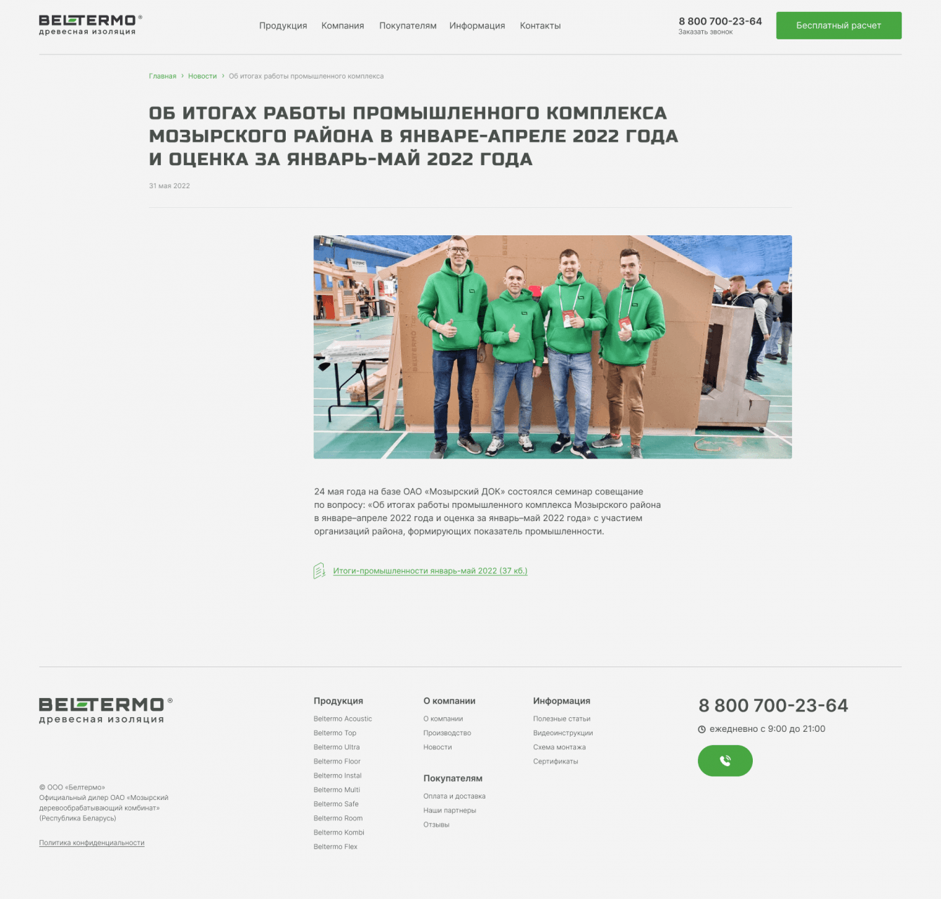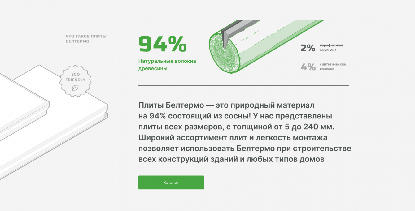 Заказчик хотел создать интернет-витрину изоляционных плит Белтермо, которая бы выгодно презентовала компанию и ее продукцию покупателям из России.