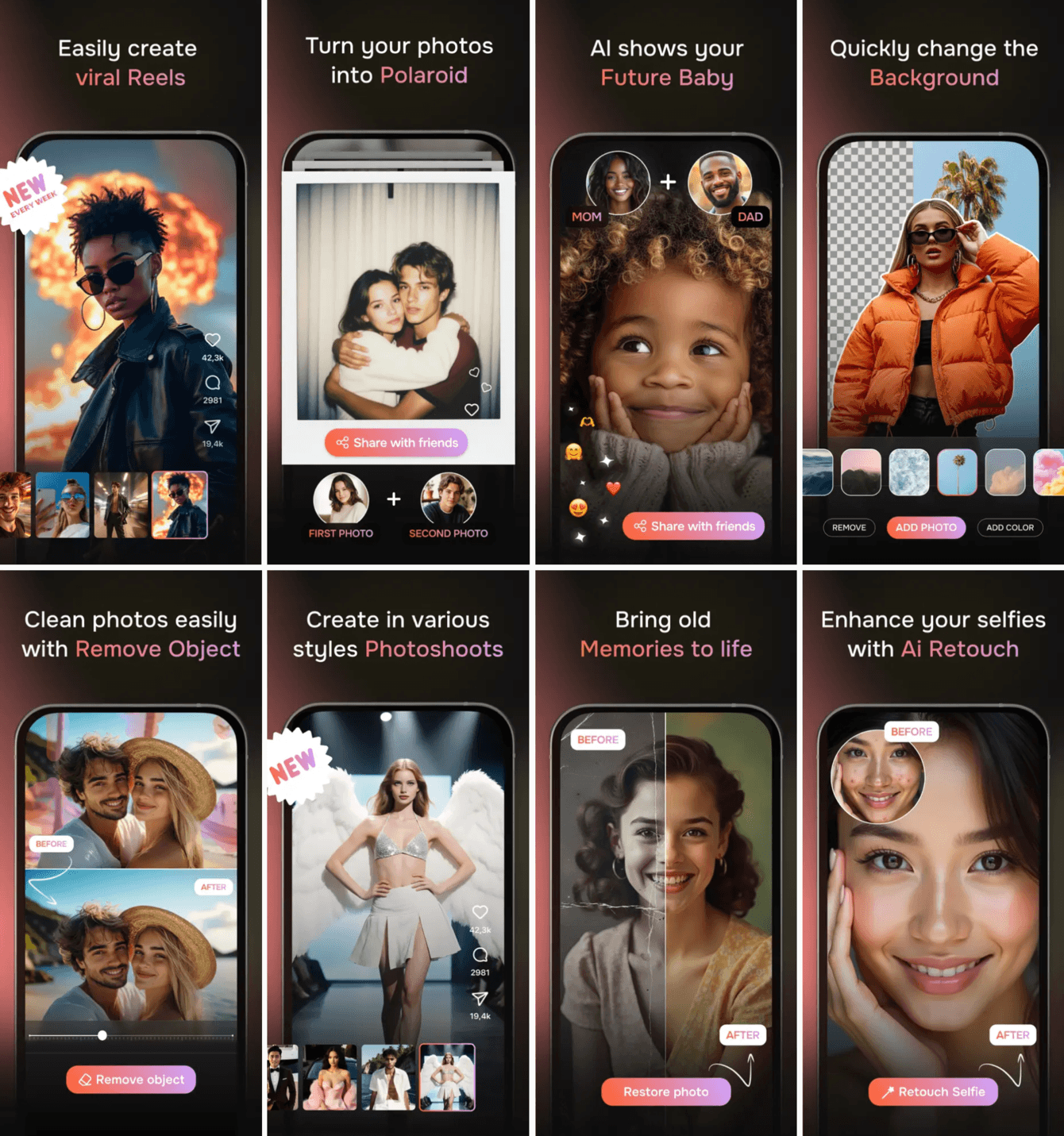 На этом этапе я реализовал сложнейшие функции: Future Baby, Viral Reels и AI-фотосессии (100+ стилей). Основной вызов был в скорости: видеогенерация требовала огромных ресурсов.