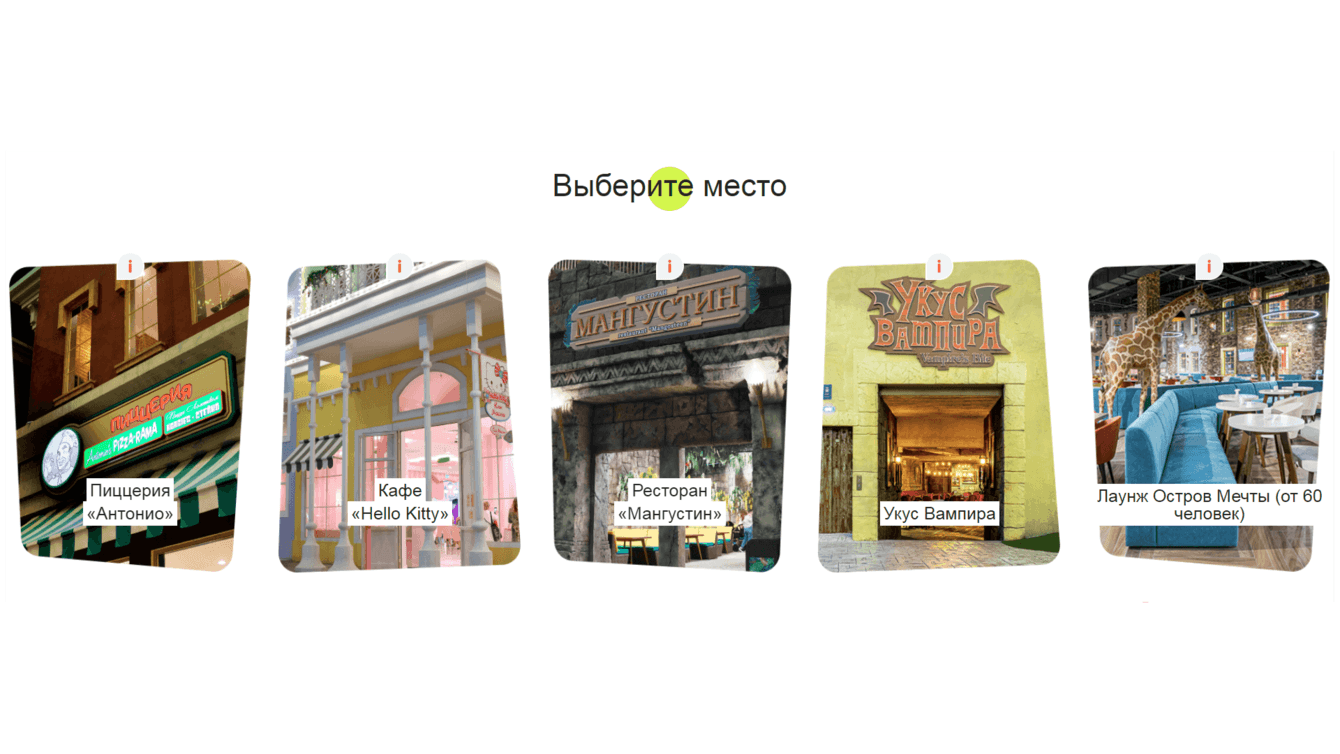 Реализован блок с выбором ресторана или кафе.