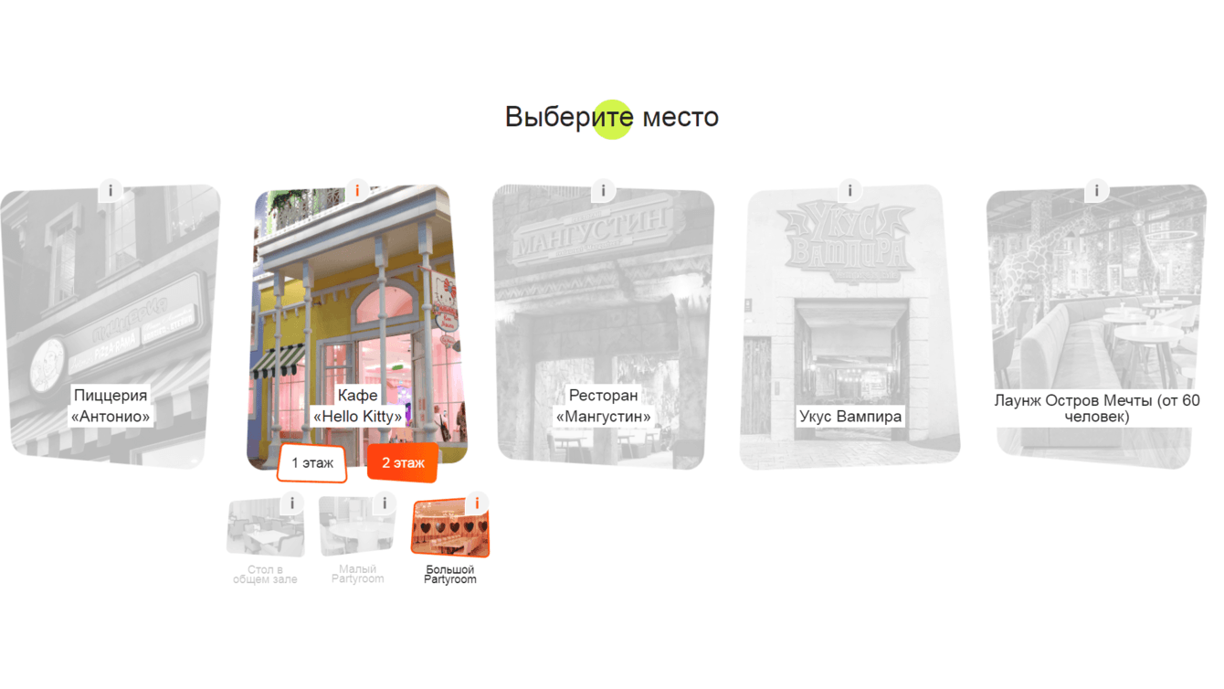 После того как клиент определился с местом, он может выбрать конкретный этаж и зал.