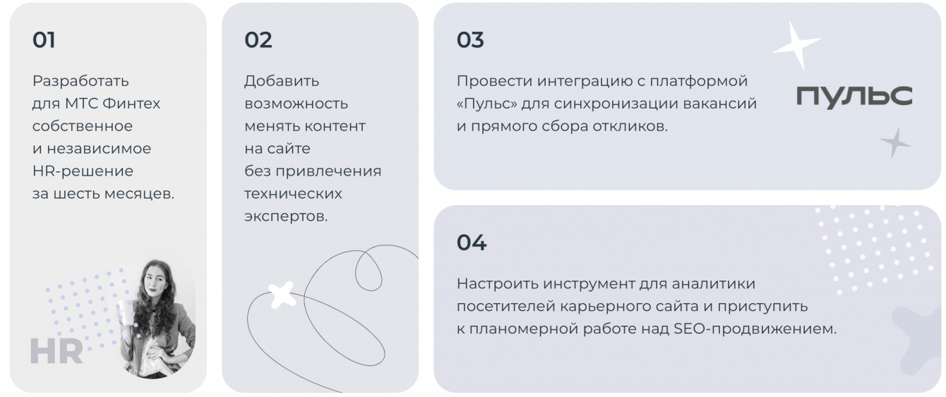 У команды «Иностудио» только успешные кейсы в работе с поисковой оптимизацией. Последний пример — увеличение переходов на карьерный сайт известного банка в два раза. Соответственно, помимо реализации HR-инструмента, мы предложили МТС Финтех свою помощь в сокращении стоимости откликов кандидатов при помощи SEO.