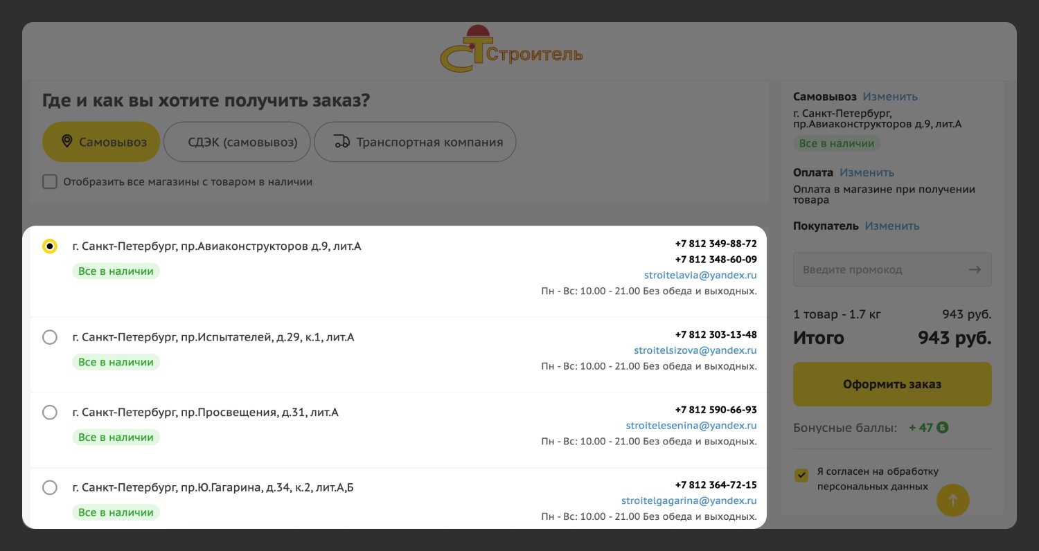 Наш клиент – компания ООО «ОЦО «Строитель» является сетью розничных и оптовых магазинов строительных материалов в Санкт-Петербурге (14 торговых точек). Онлайн-продажи реализованы через интернет-магазин на готовом решении.