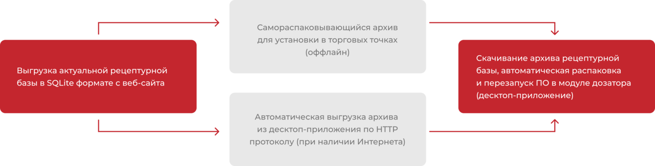 - возможность онлайн и оффлайн выгрузки рецептурной базы (для последующей загрузки рецептурной базы в модуль взаимодействия с дозатором).