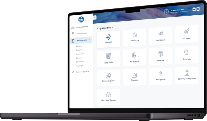 - загрузка рецептурной базы и колеровка (по выбранной рецептуре или для собственных рецептур под конкретного клиента).