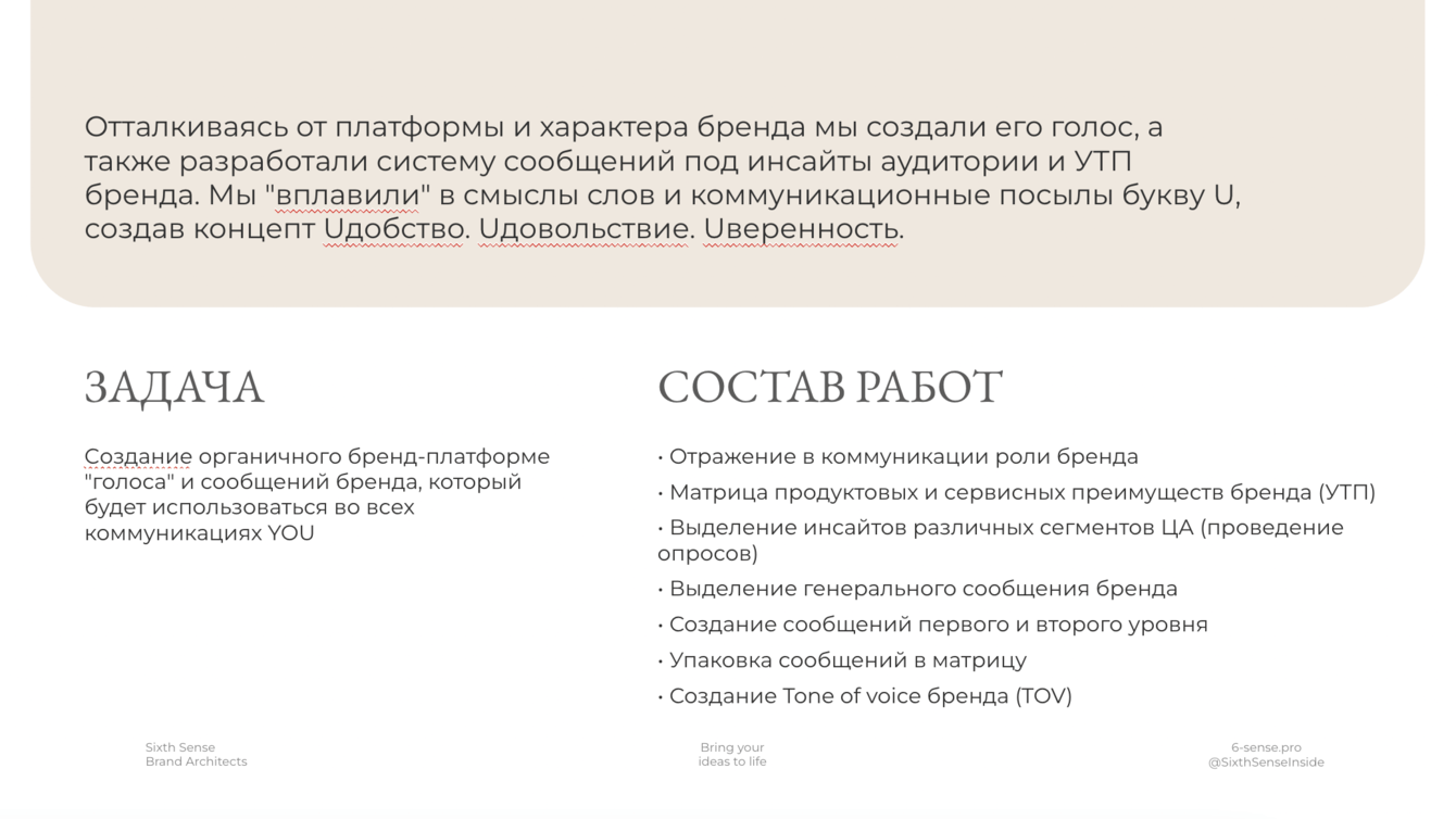 Команда Sixth Sense совершила для бренда YOU главное и самое ценное: в короткие сроки произвела революцию в головах собственников и части команды, а также трансформировала незаметный скромный бизнес по производству и продаже женской одежды из Санкт-Петербурга в яркую уникальную сущность.