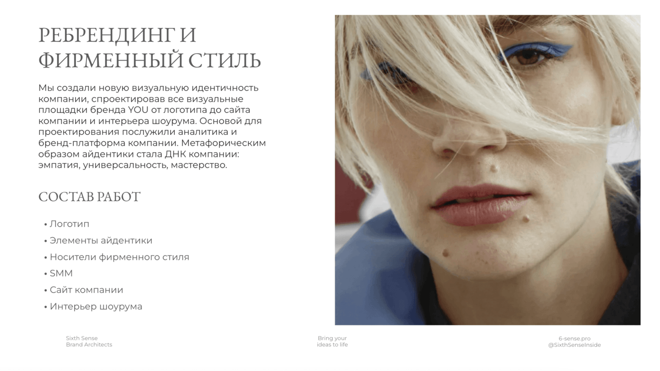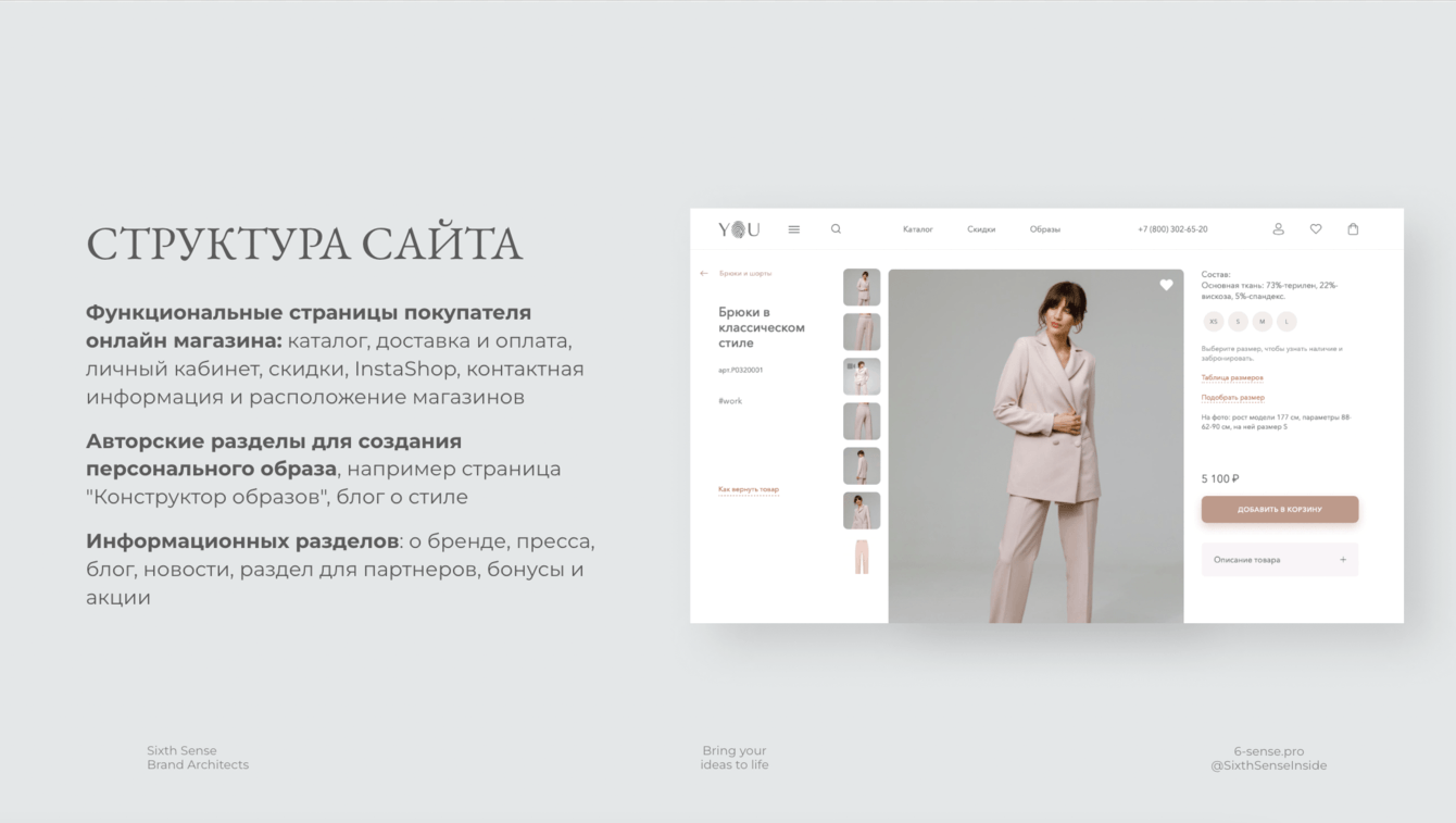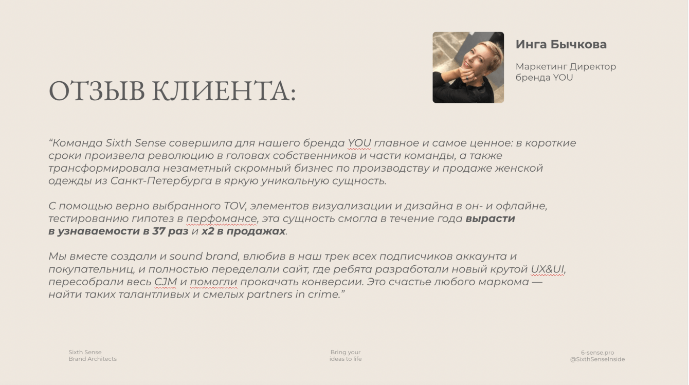 Команда Sixth Sense совершила для бренда YOU главное и самое ценное: в короткие сроки произвела революцию в головах собственников и части команды, а также трансформировала незаметный скромный бизнес по производству и продаже женской одежды из Санкт-Петербурга в яркую уникальную сущность.