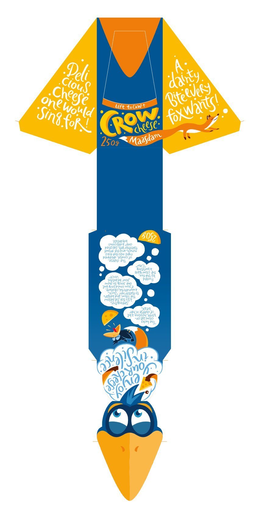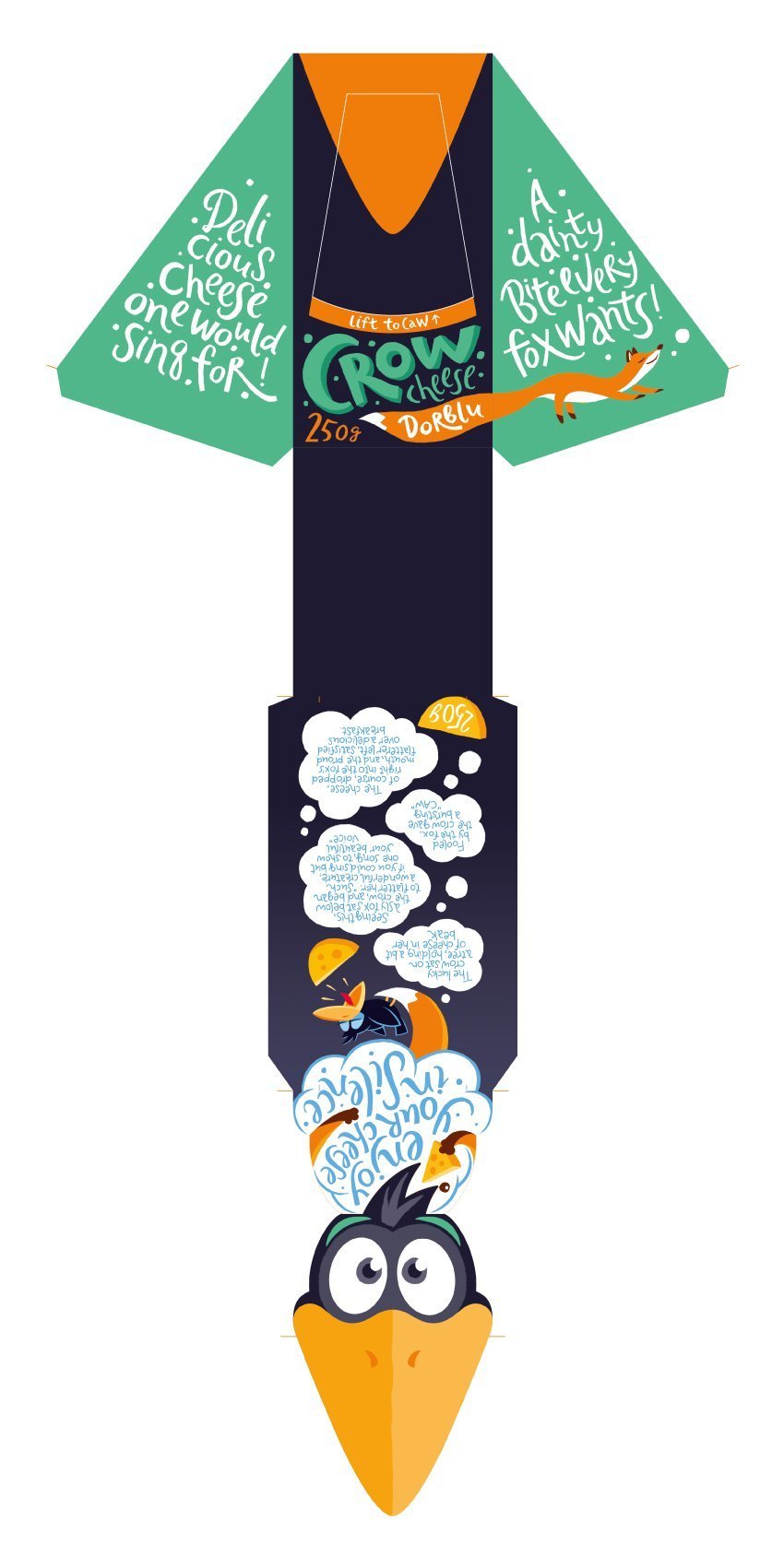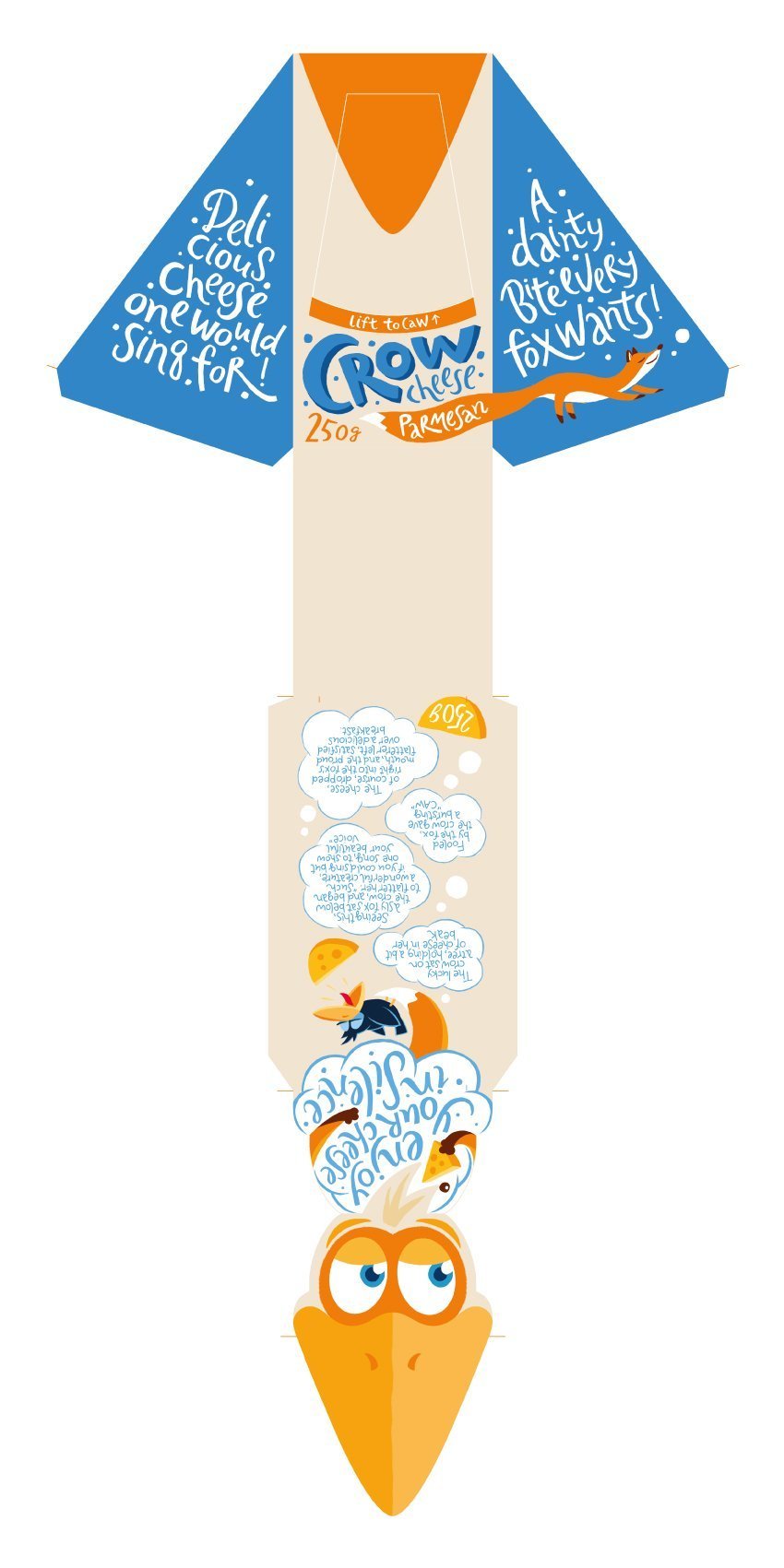 Идея вдохновлена известной басней о вороне и сыре. На упаковке изображен тот самый, счастливый момент в начале истории, когда ворона раздобыла «кусочек сыру». Клюв можно поднять вверх, чтобы увидеть развязку басни – ворона теряет желанный сыр. Чтобы открыть упаковку нужно потянуть ворону за клюв, и забрать свое.