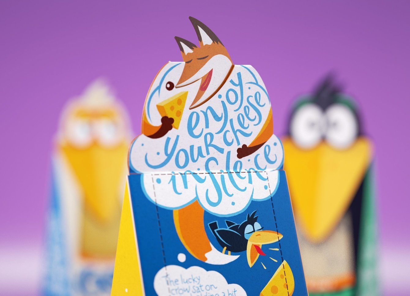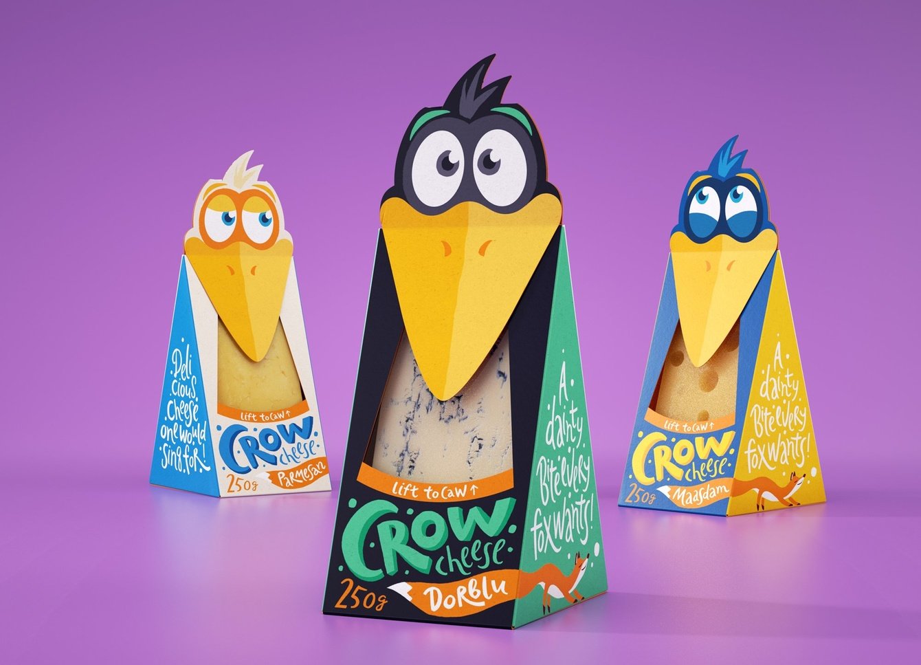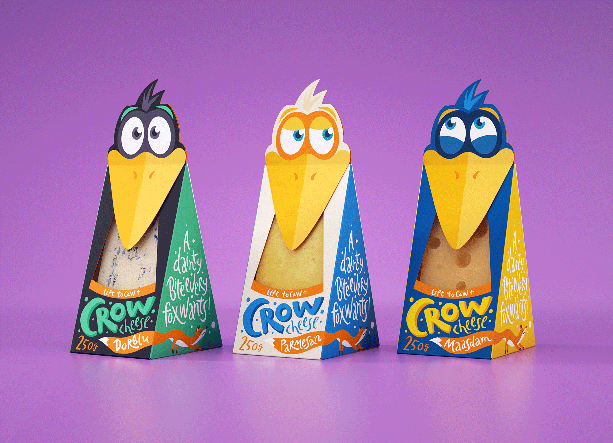 Идея вдохновлена известной басней о вороне и сыре. На упаковке изображен тот самый, счастливый момент в начале истории, когда ворона раздобыла «кусочек сыру». Клюв можно поднять вверх, чтобы увидеть развязку басни – ворона теряет желанный сыр. Чтобы открыть упаковку нужно потянуть ворону за клюв, и забрать свое.