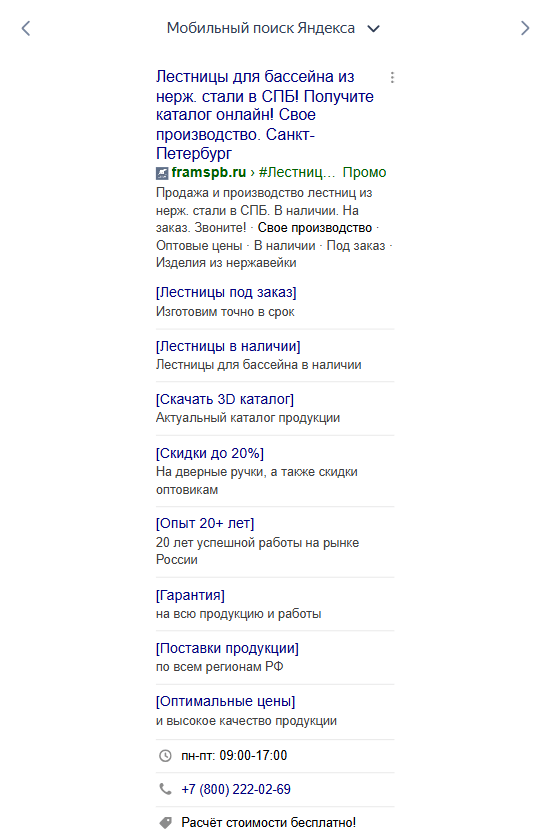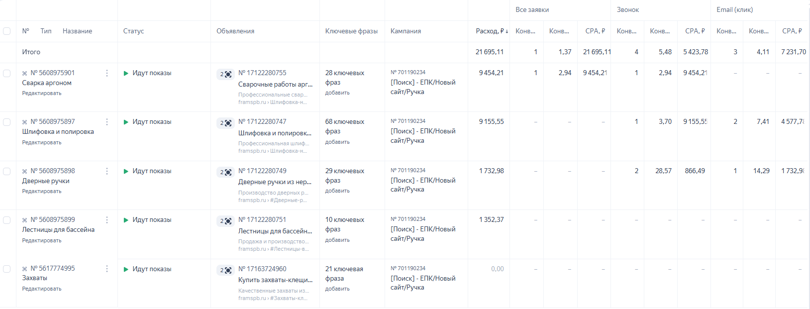 К нам обратилась компания «ПСК ФРАМ» - производство изделий из нержавеющей стали и стекла в СПб (работаем уже более 3х лет по текущий момент, на дату написания кейса). Клиент пришел с запросом разработать с нуля контекстную рекламу в Яндекс. Основные направления для продвижения на всем этапе работ: продажа готовой продукции, изготовление продукции на заказ, а также предоставление услуг (полировка нержавейки, сварка аргоном).