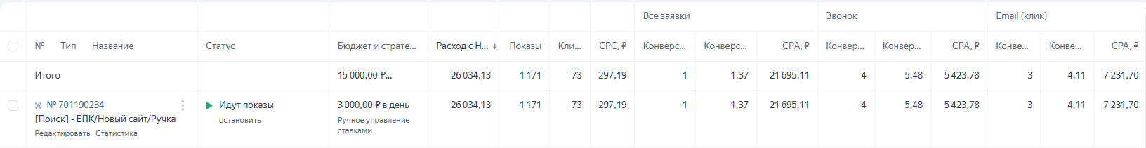 Для продвигаемых товаров запустили Товарную Кампанию, которая не показала эффективности и была отключена. Из-за небольшого количества целевой аудитории система либо не могла ее найти, либо показывала объявления не по целевым для нас запросам. После этого приняли решение работать с горячим спросом на Поиске.