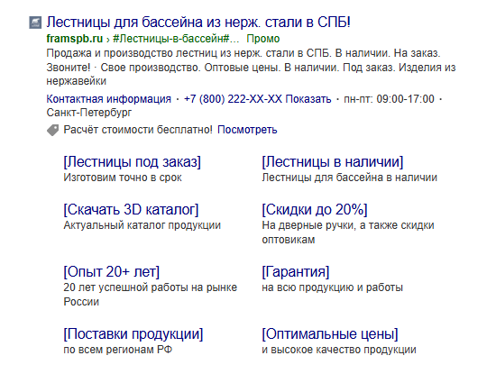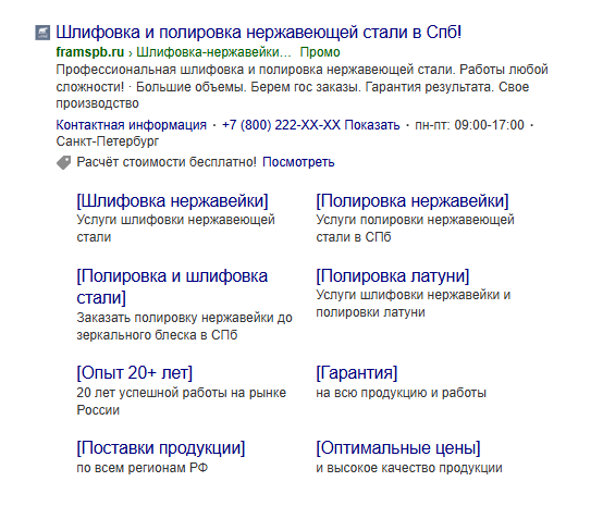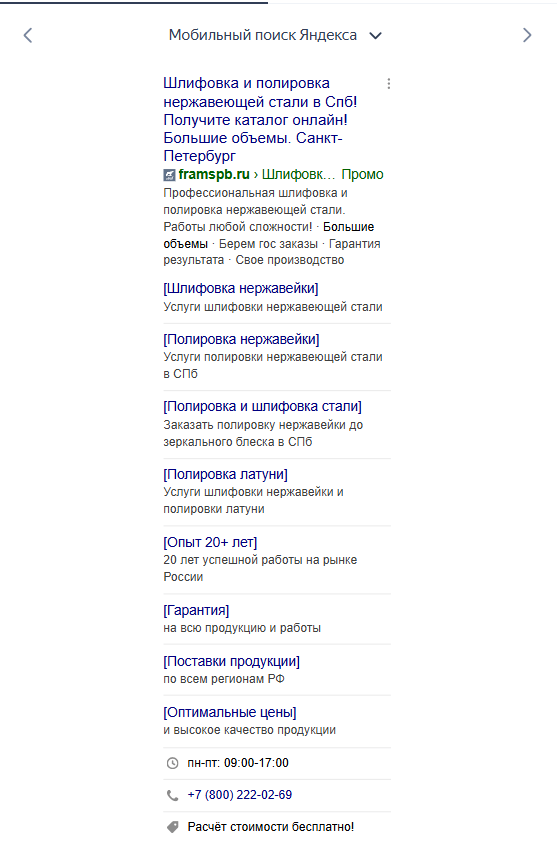 После сбора семантики создали по 2 объявления для каждой группы в Поисковой кампании, заполнили все элементы объявлений (заголовок, текст, отображаемую ссылку, 2й заголовок, уточнения, Быстрые Ссылки и Промоакцию), чтобы значительно увеличить размер объявления на Поиске и прописать все преимущества/условия.