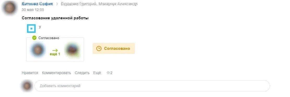2. Важный процесс на нашем корпортале — согласование удалённой работы. Стандартное «отсутствие» в Битрикс24 оформляется как отпуск и подразумевает, что на сотрудника невозможно поставить задачу. «Удаленная работа» — специальный тип отсутствия, который понимает, что сотрудник на рабочем месте и выполняет задачи.