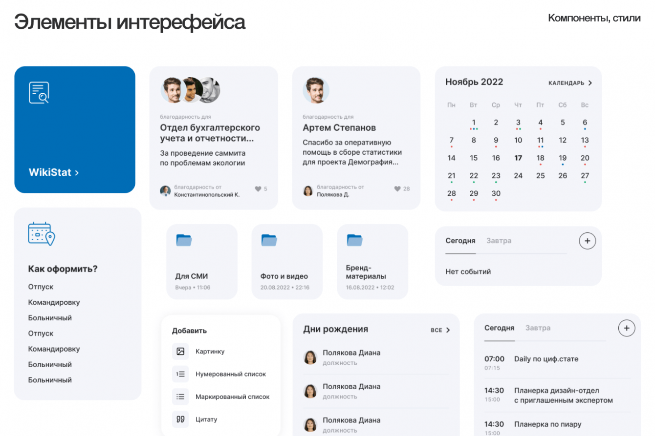 - Добавить в дизайн элементы новостного портала, чтобы погрузить пользователей в корпоративную жизнь и познакомить коллег из разных городов.