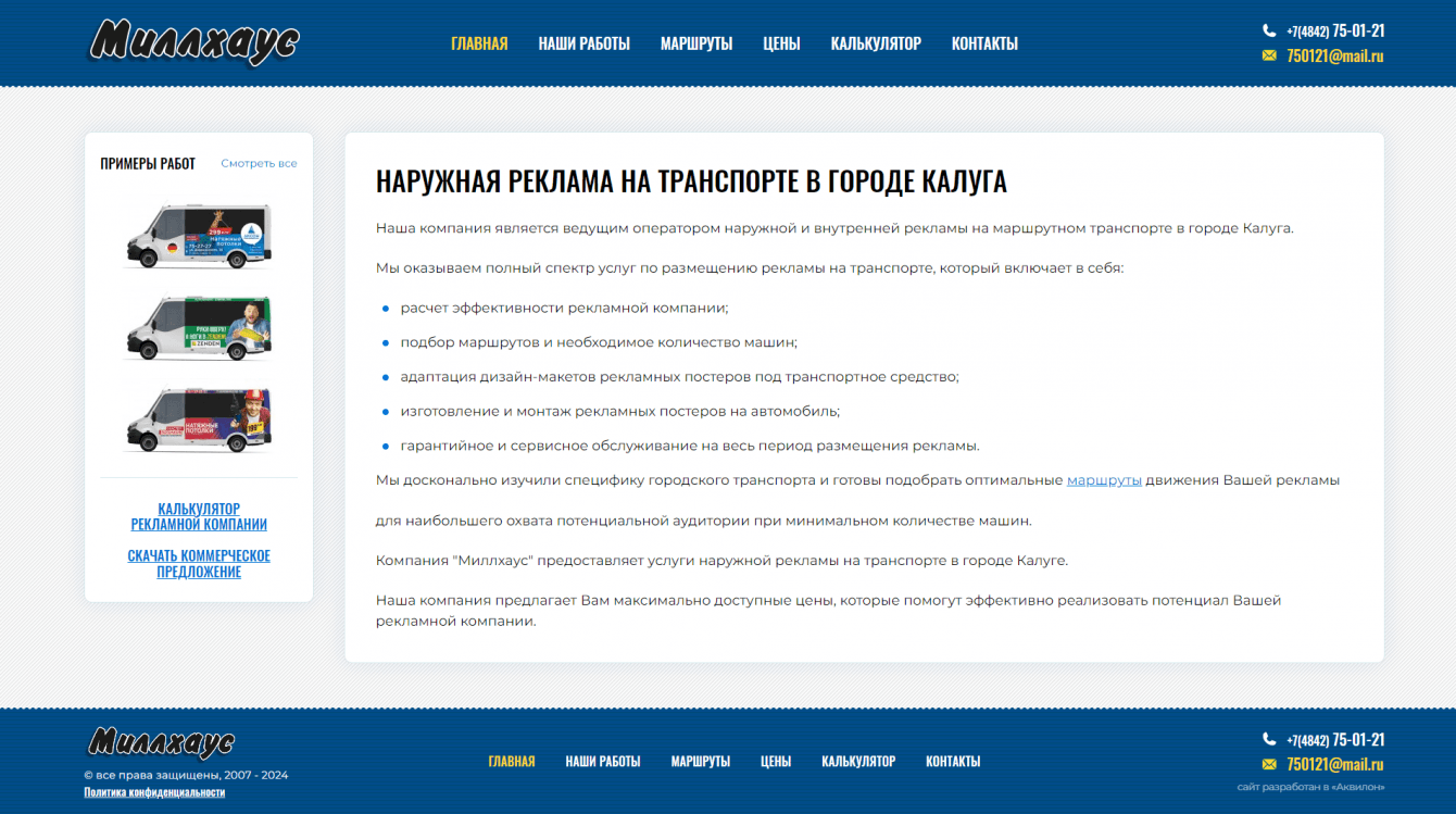 3. Контент: для сайта был разработан качественный контент, включающий информацию о услугах компании, преимуществах размещения рекламы на транспорте, портфолио проектов и контактную информацию.