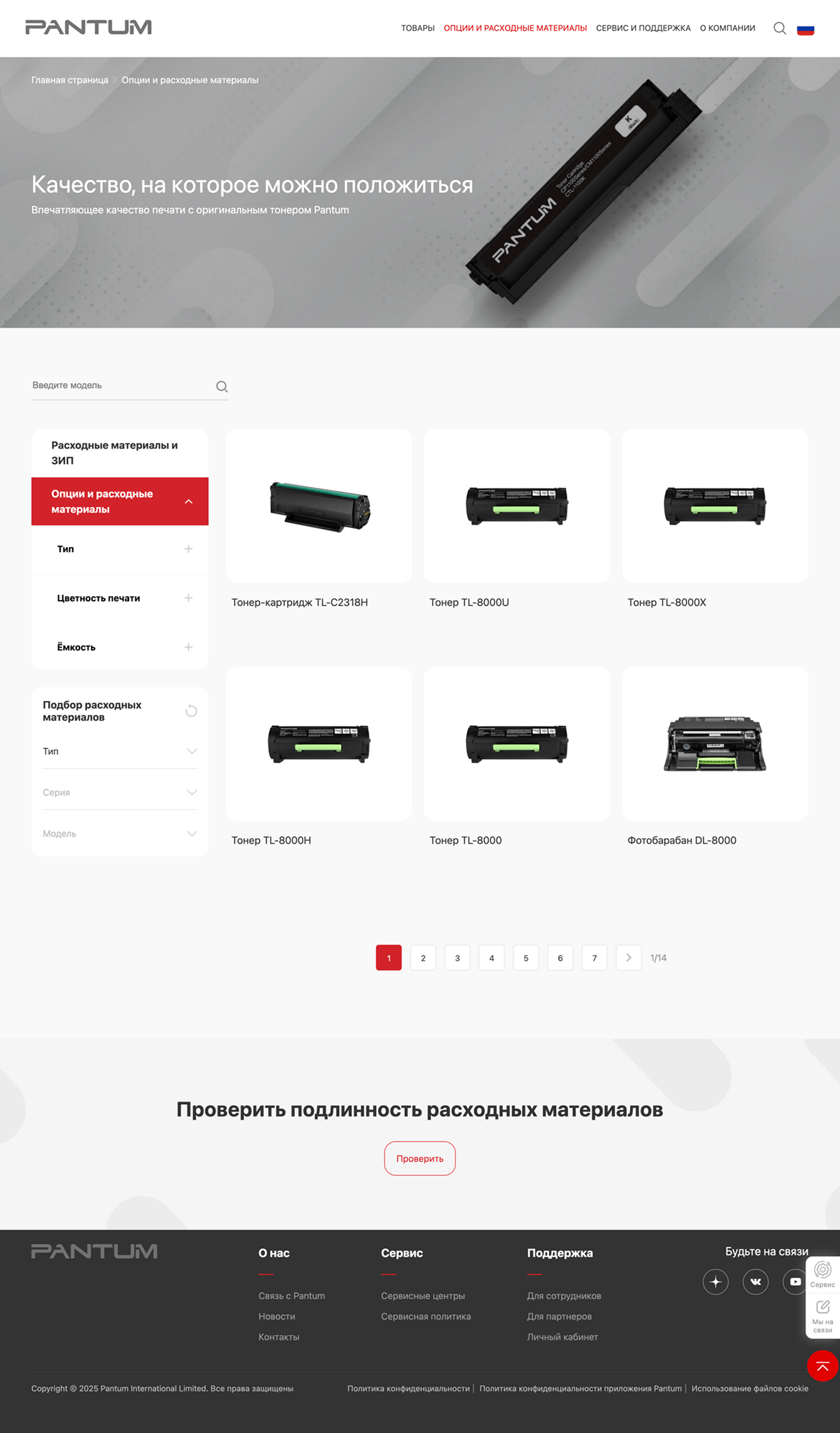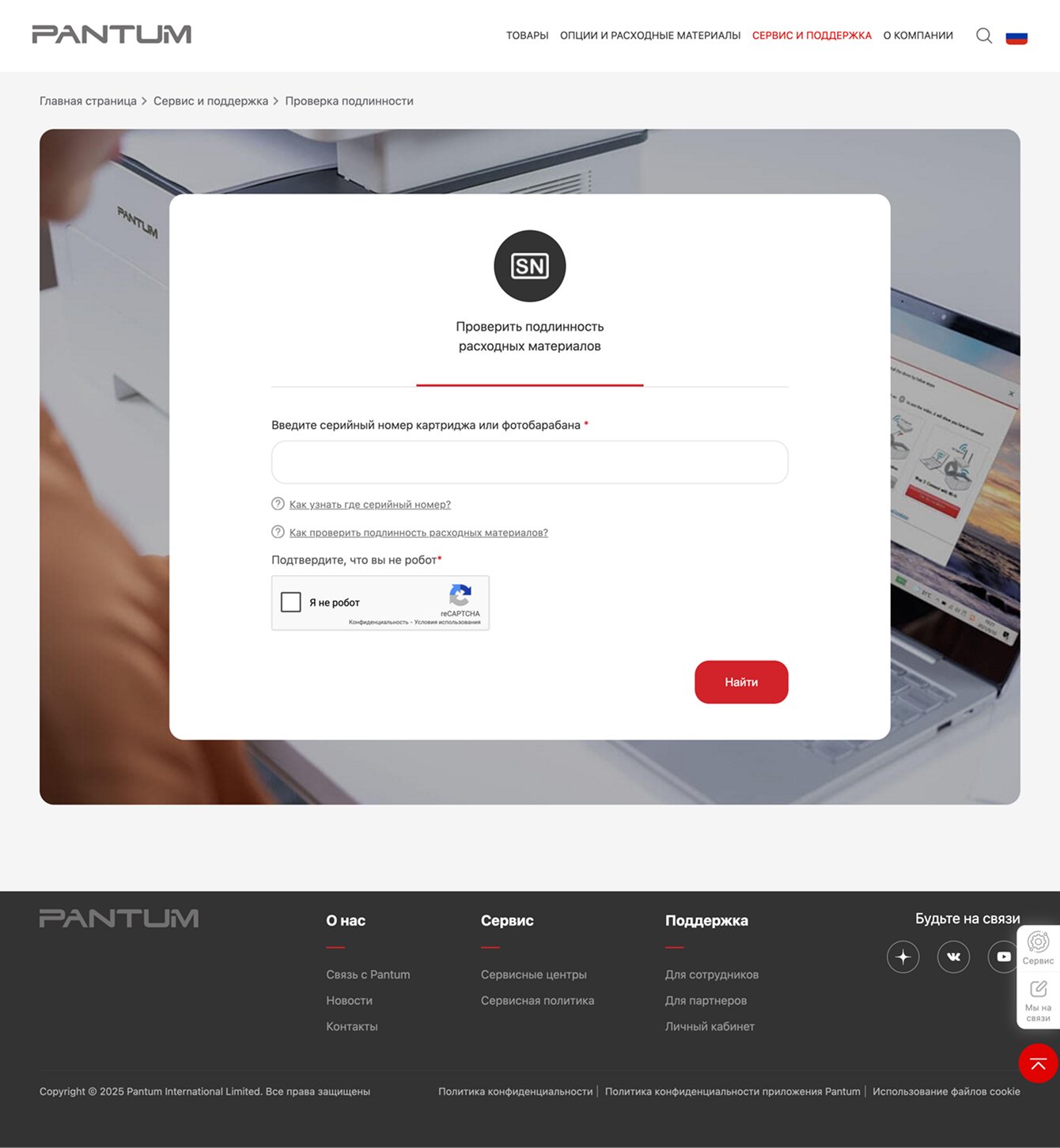 Раздел позволяет проверить подлинность расходных материалов с помощью ввода серийного номера. А также предоставляет пользователю информацию о дополнительных проверках на оригинальность продукции.