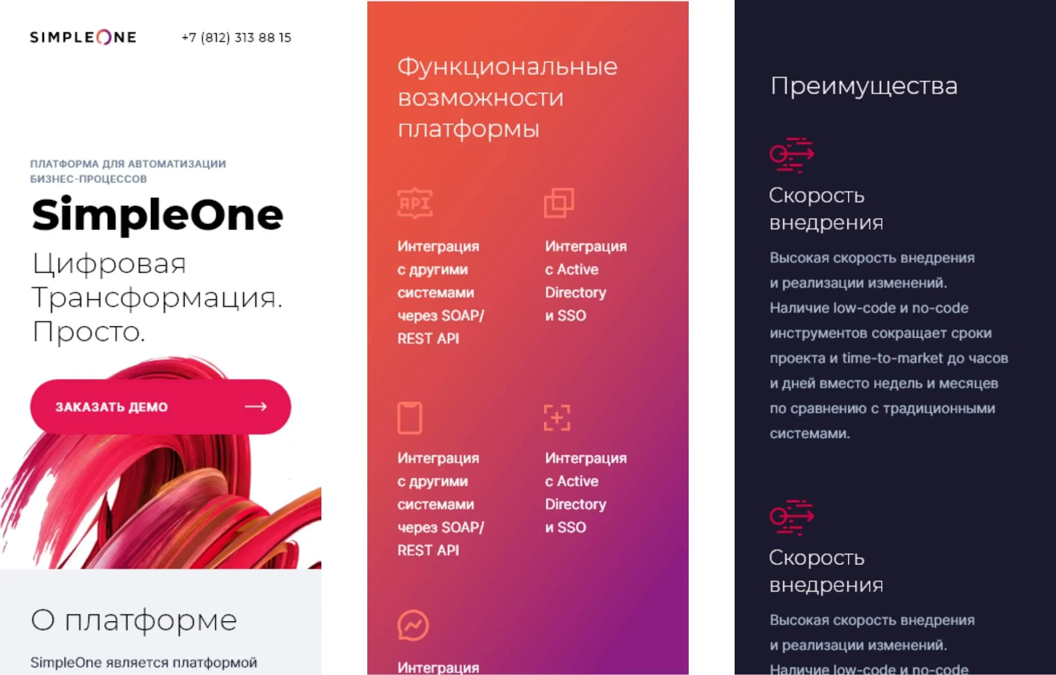 Новый сайт должен был отражать концепцию самого продукта: показывать сложное через простое. Компания обладает большим опытом разработки высоконагруженных систем с большой производительностью, что требовалось лаконично показать в каждом решении сайта.
