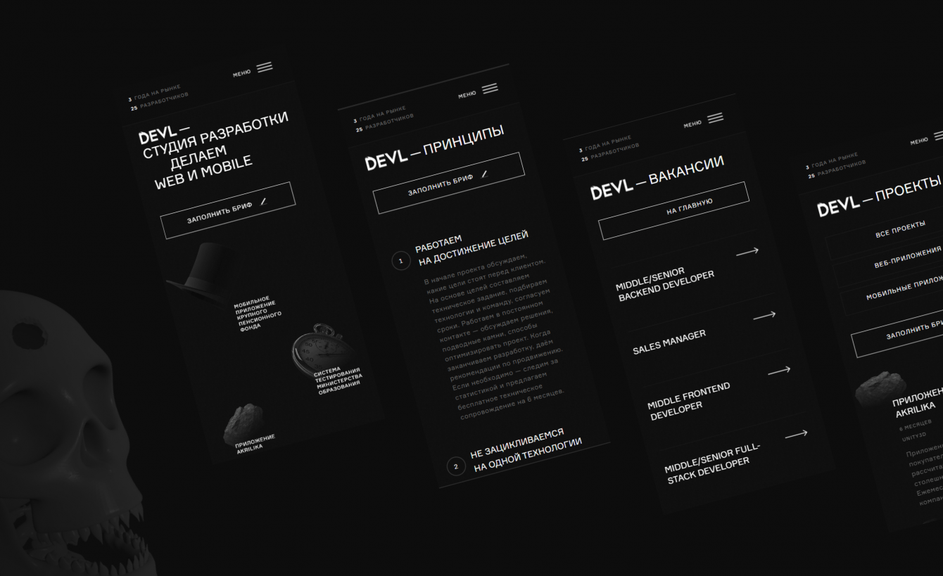 Одной из особенностей сайта является концепция одного экрана — большинство страниц на ПК построены таким образом, чтобы у пользователя не было нужды скролить страницу.