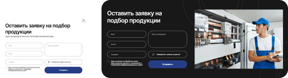 Новый сайт получил возможность оформления онлайн-заказов. Пользователи могут добавлять товары в заявку или отправлять свои сметы с требуемым оборудованием на просчет стоимости. Все заявки с сайта отправляются на почту менеджерами компании.