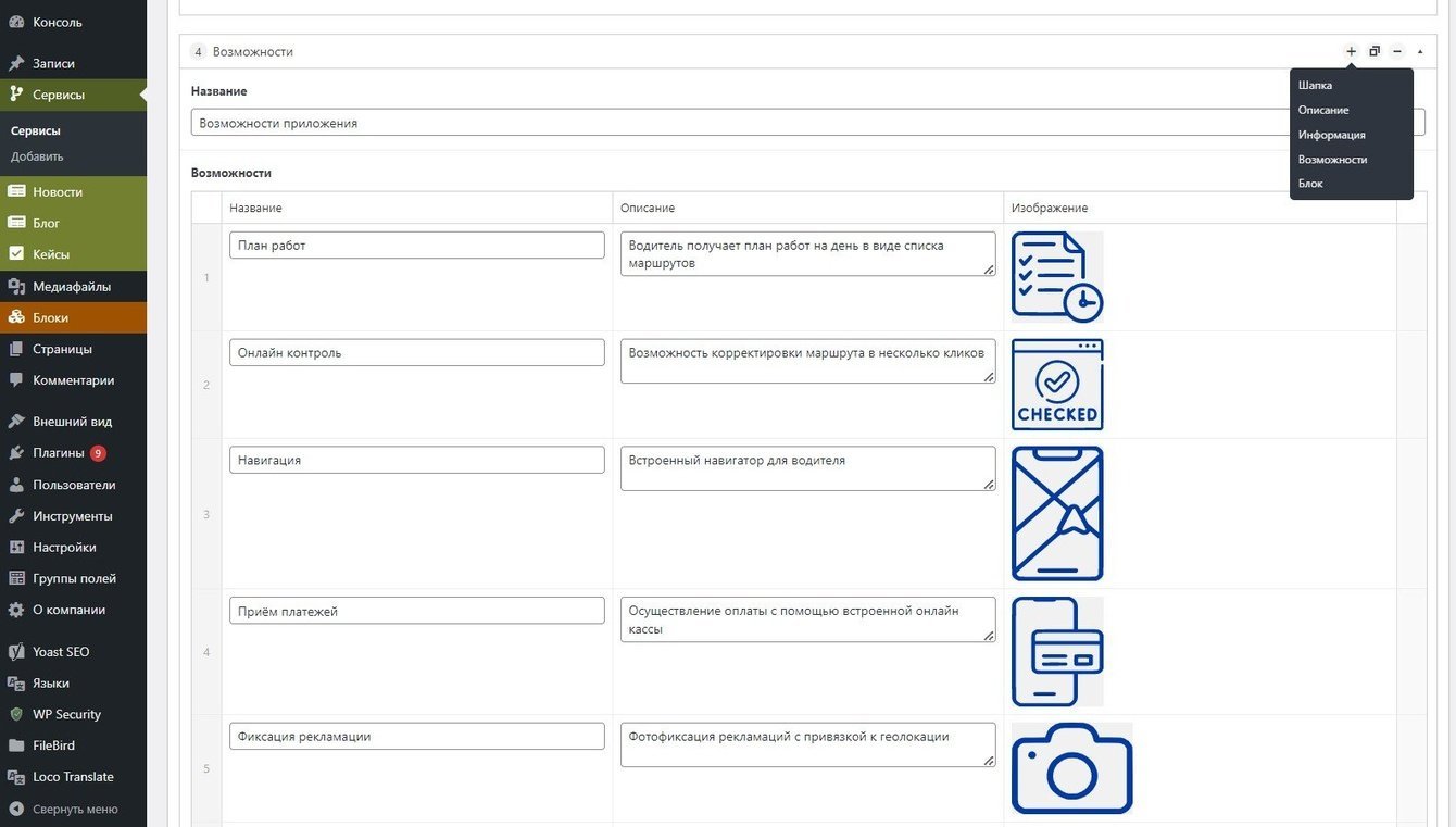 Разделы “Сервисы”, “Новости”, “Кейсы” реализованы как кастомные конструкторы. Это позволяет менять местами/ добавлять, скрывать блоки, что делает сайт гибким и удобным в использовании. Редактировать материалы можно без вмешательства разработчиков. Это не только экономит время, но и средства.