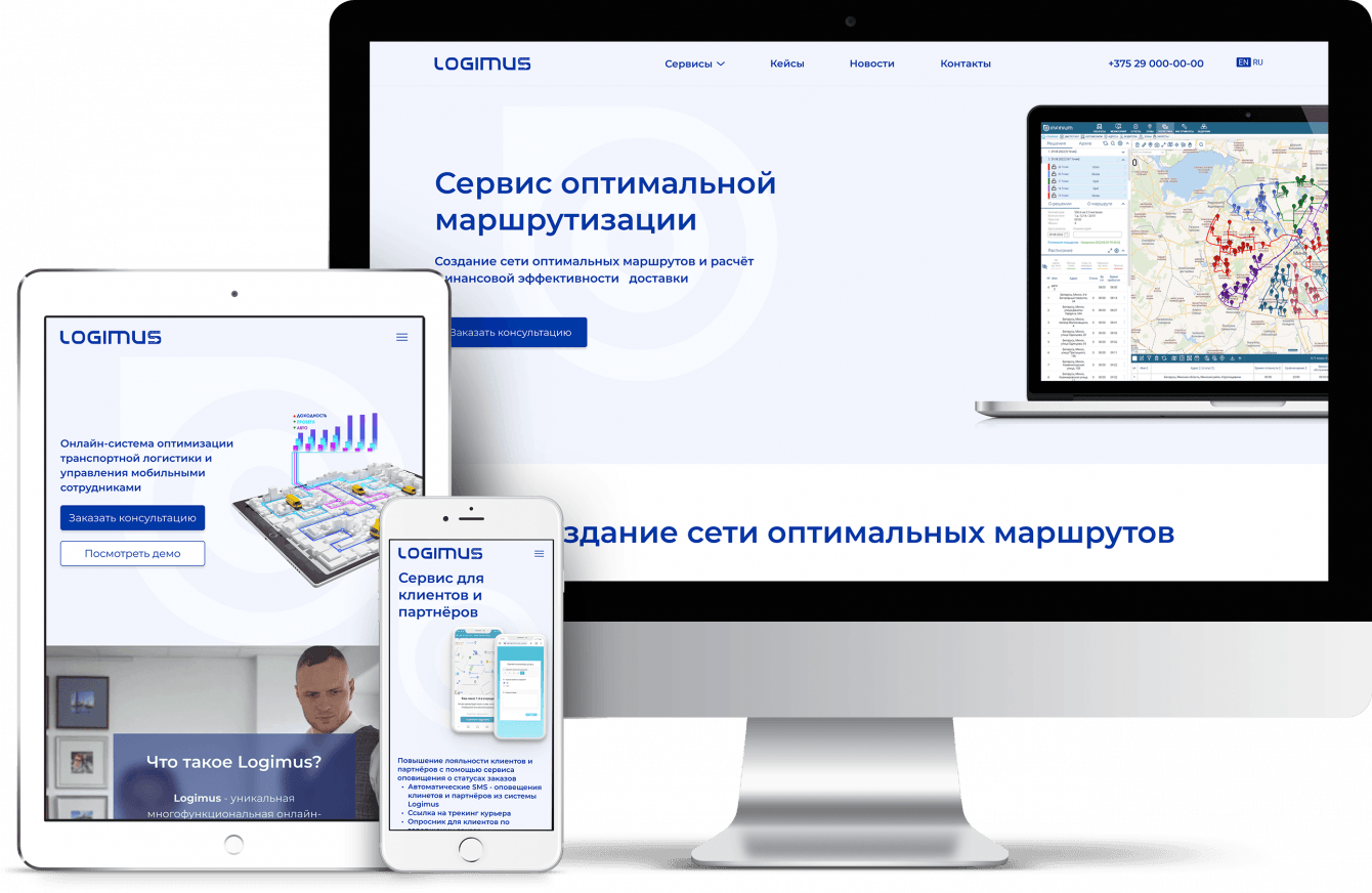 Необходимо было разработать корпоративный сайт для компании Белтрансспутник под продукты Logimus для презентации продуктов и кейсов.