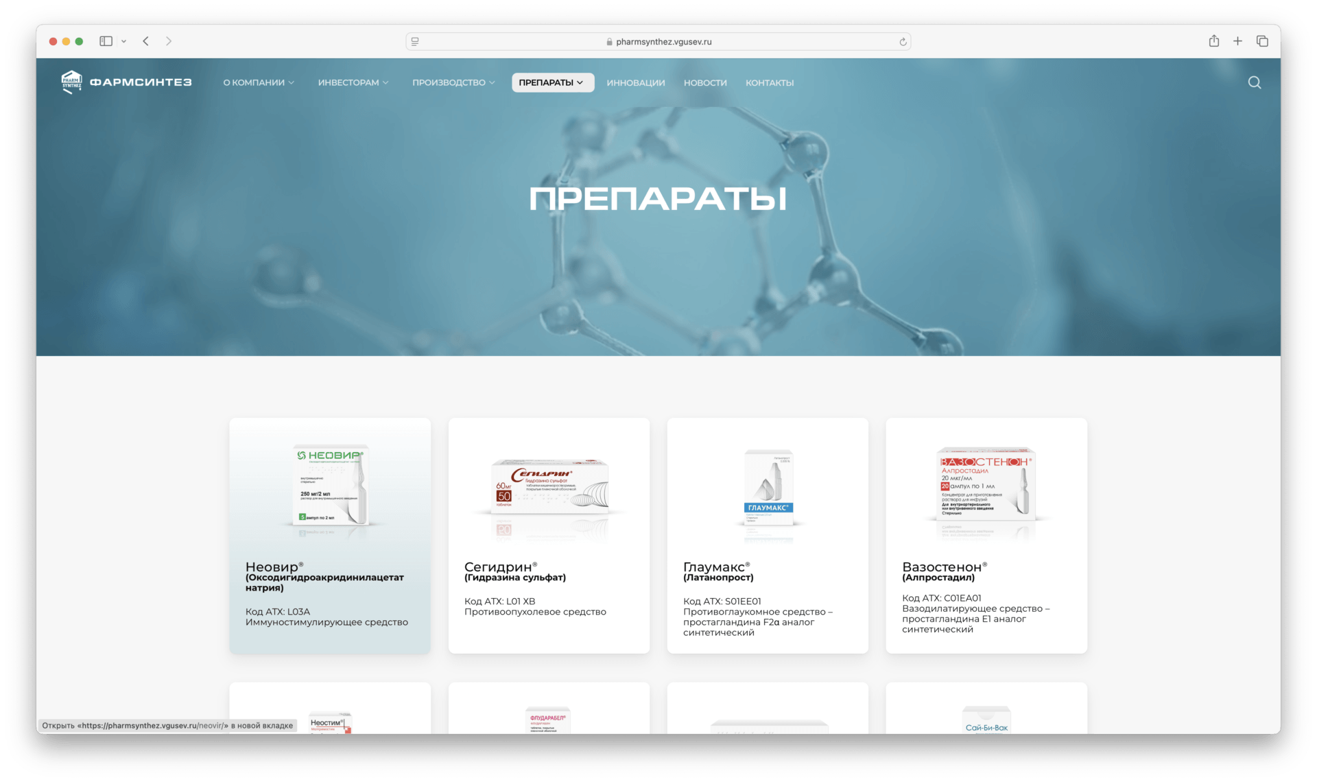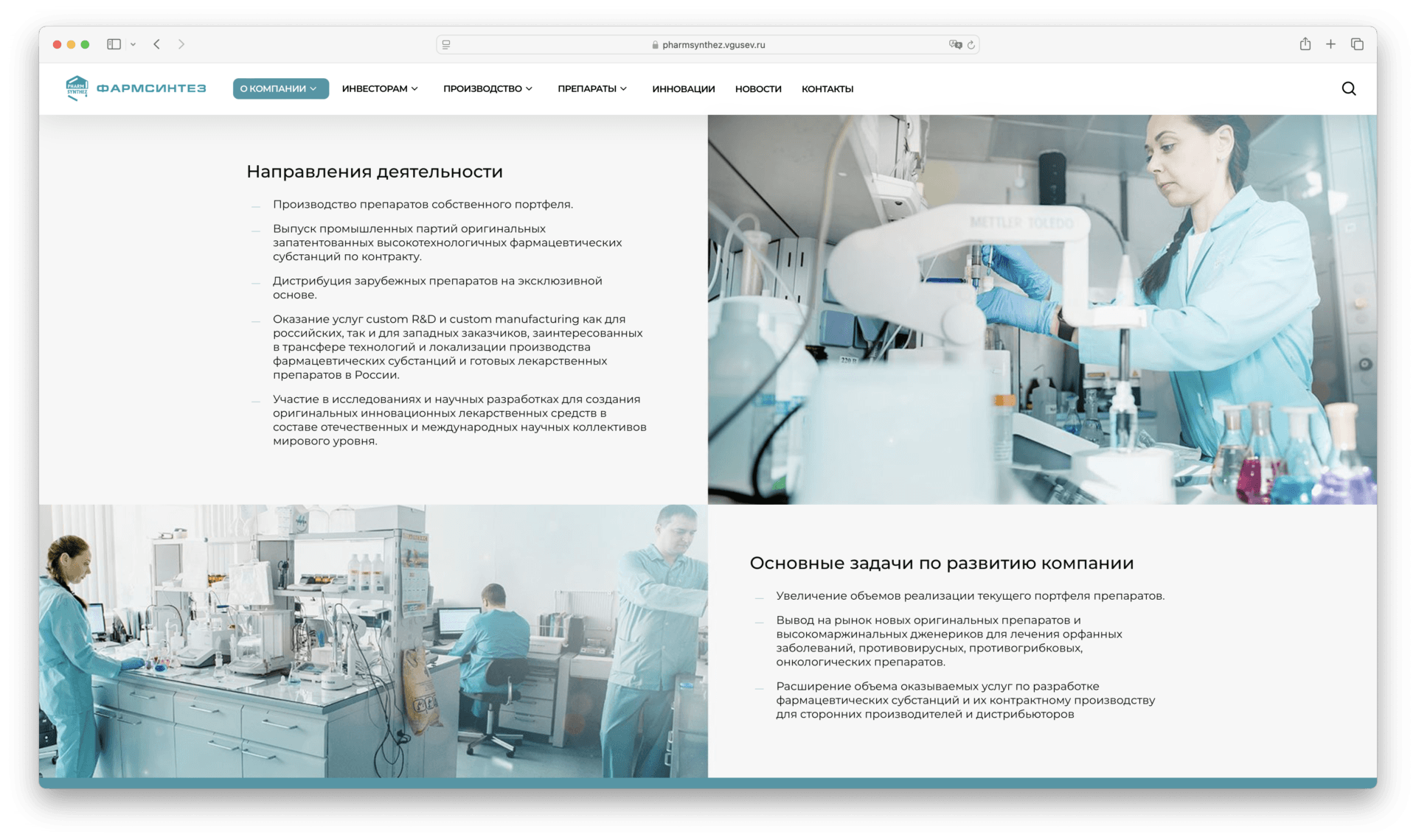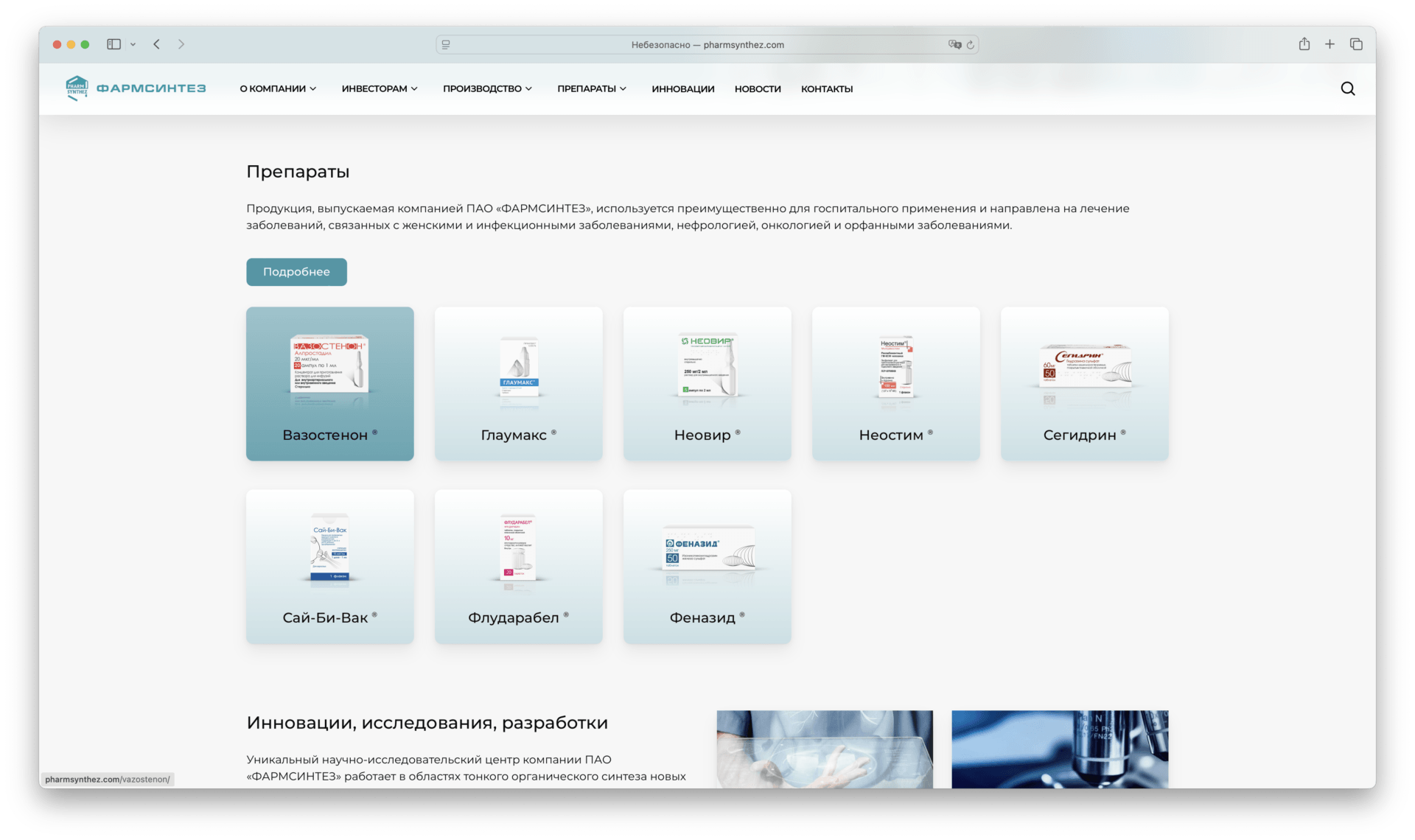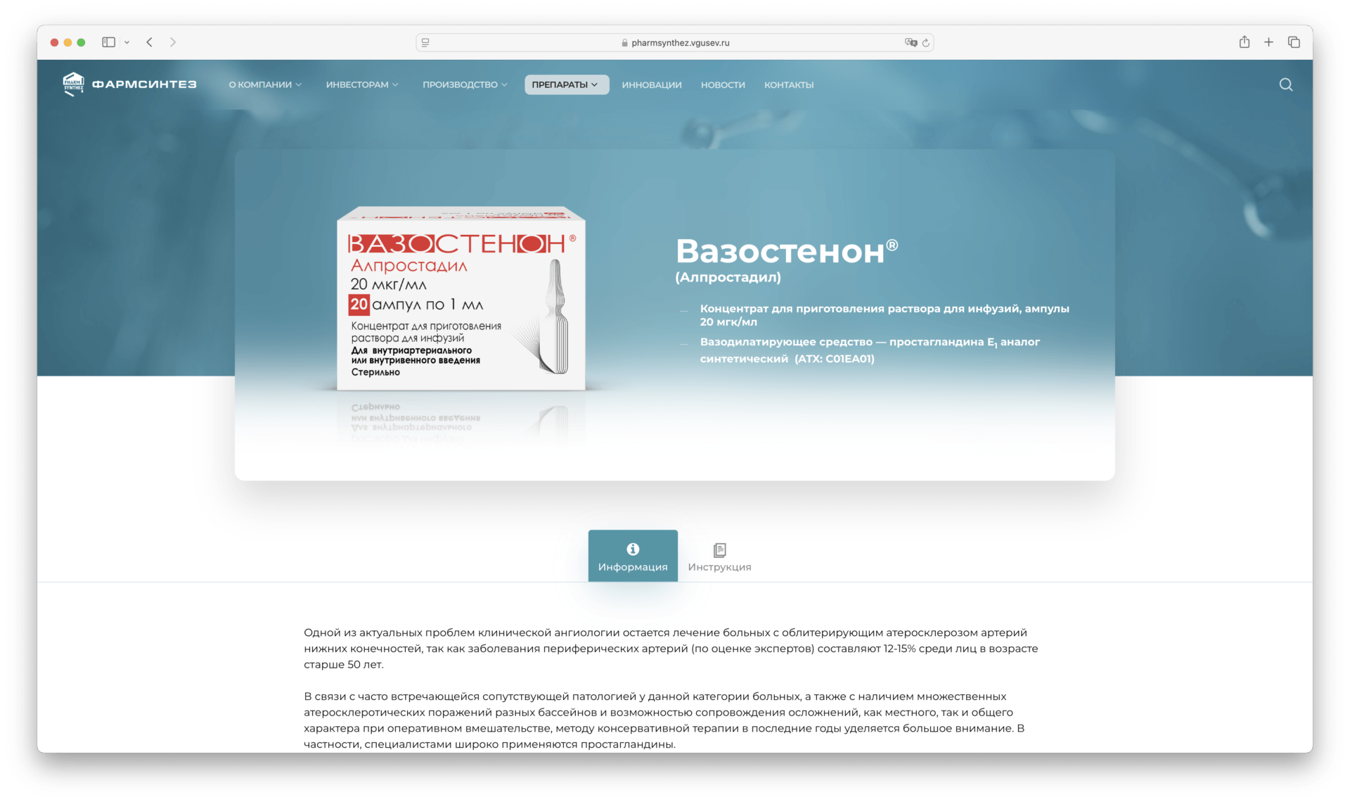 Разработка корпоративного сайта и отдельных промо-страниц по препаратам компании. ПАО «ФАРМСИНТЕЗ» — российская фармацевтическая компания, специализирующаяся на производстве активных фармацевтический субстанций и готовых лекарственных форм, а также предоставляющая услуги контрактного производства лекарственных средств.