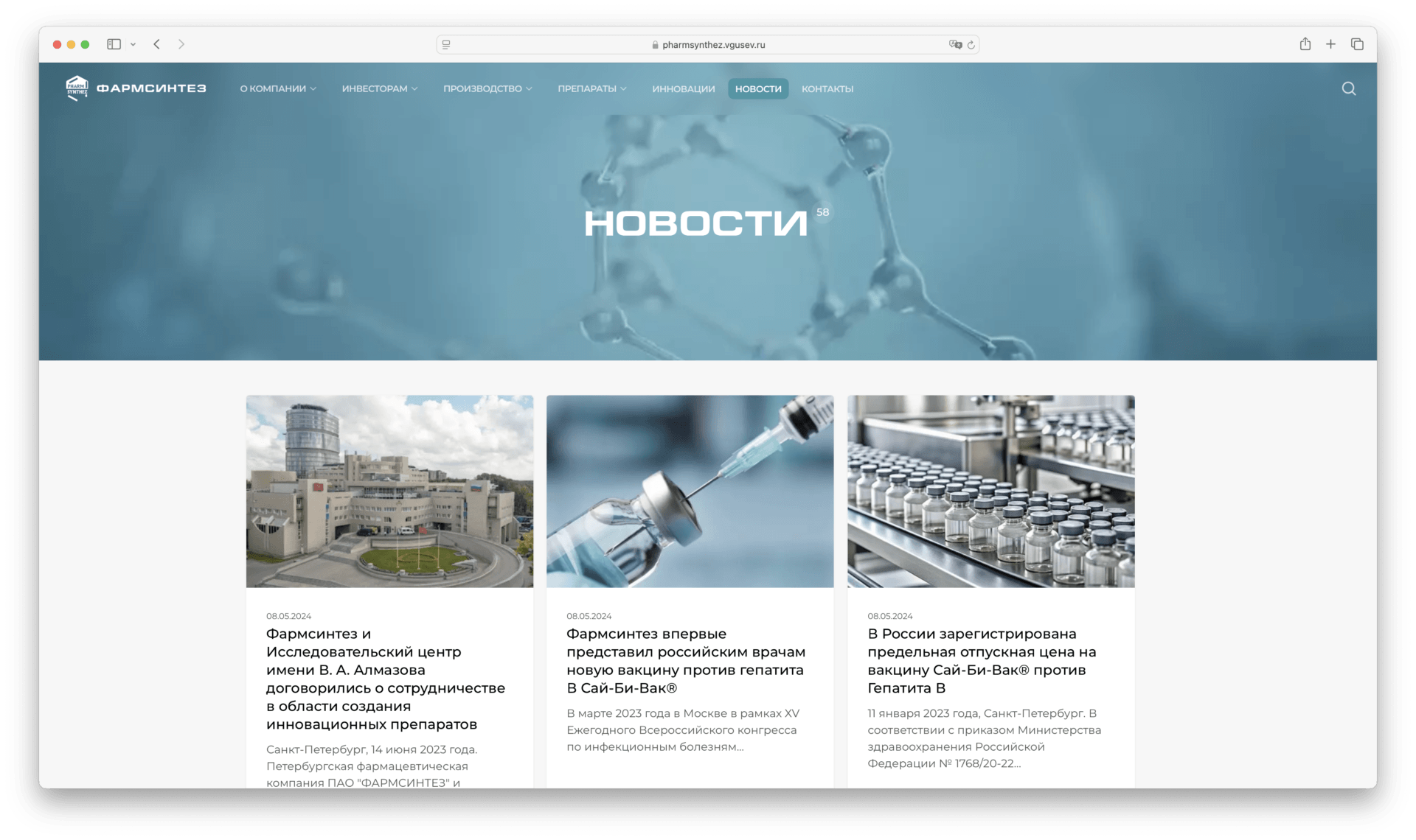 ПАО «ФАРМСИНТЕЗ» получил удобный и гибкий информационный ресурс. Подробная информация о препаратах, корпоративная информация и новости компании, весь контент на сайте управляется при помощи удобной системы управления и не требует привлечения сторонних специалистов.