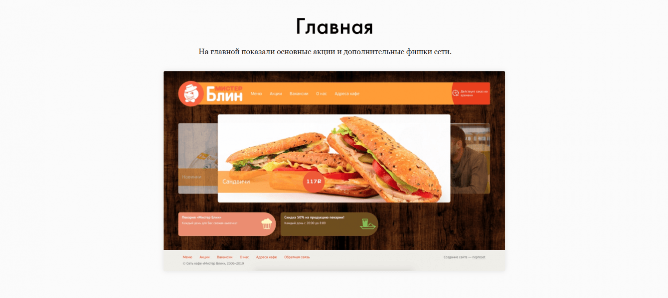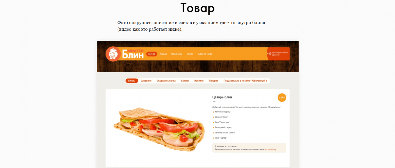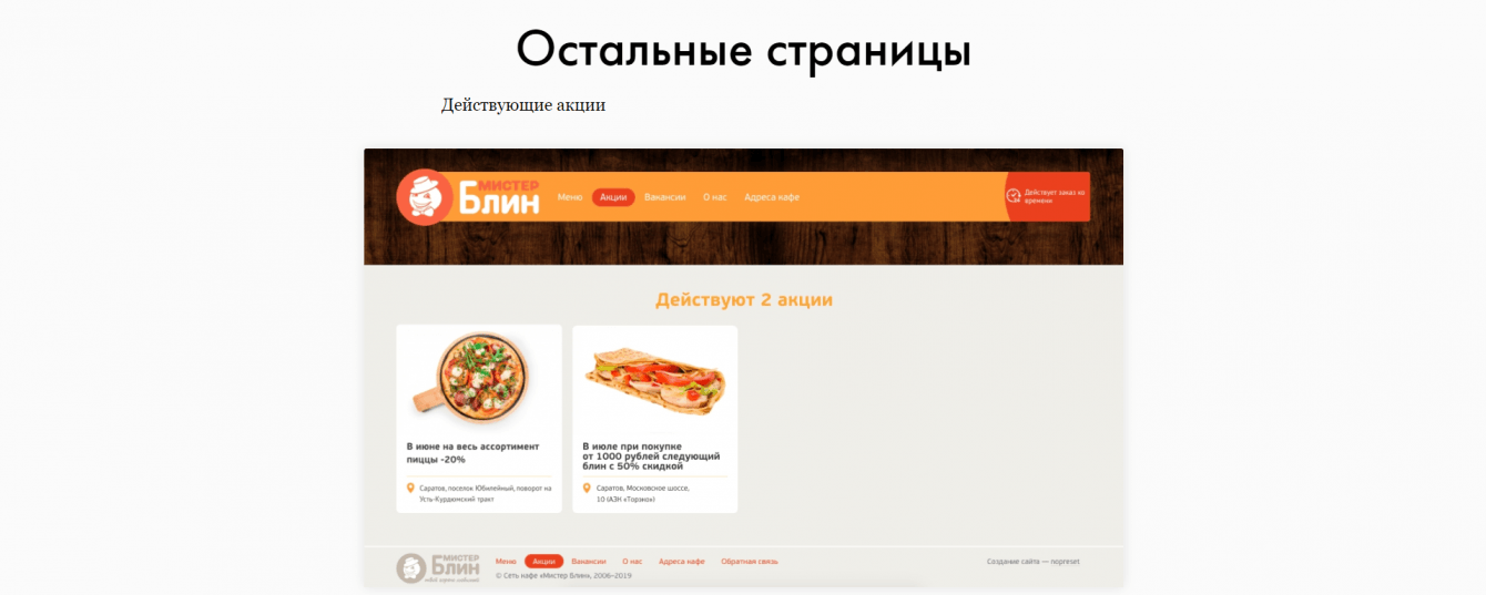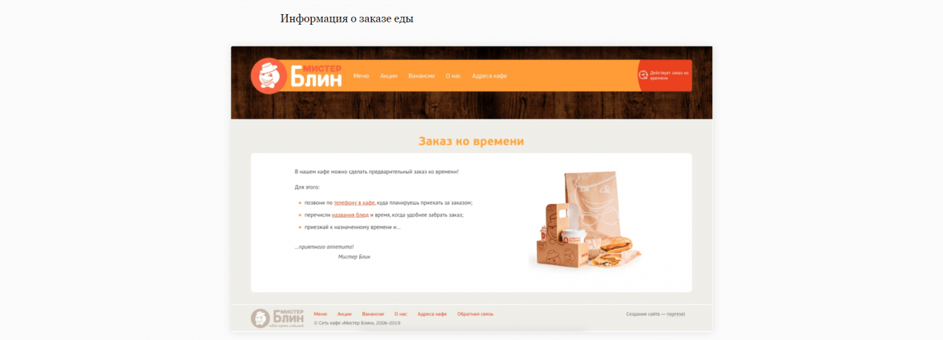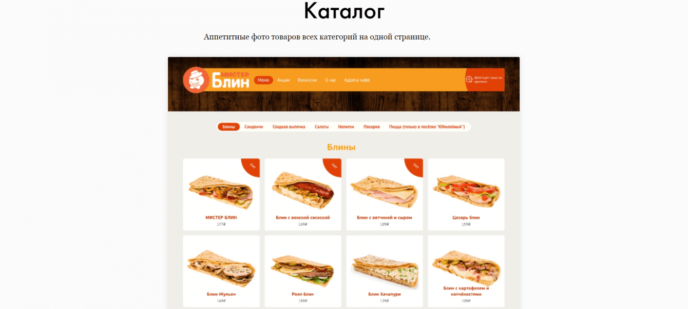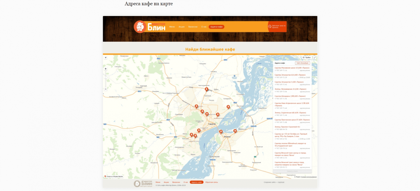 В результате совместной работы был разработан корпоративный сайт с каталогом товаров, актуальными акциями, адресами кафе. Покупатель может ознакомиться с ассортиментом на сайте и сделать заказ по телефону или на точке заказчика.