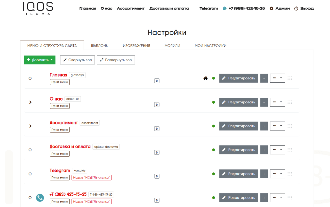 Удобная система редактирования контента (дерево разделов сайта с товарными позициями) понятна и удобна для администратора сайта. Сайт построен на платформе CMS mySite.