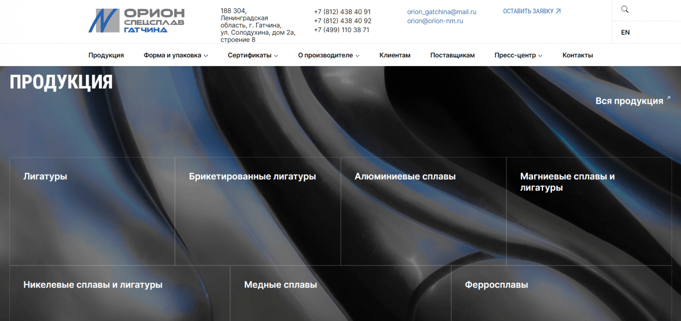 Бизнес-задача "Орион-Спецсплав-Гатчина" требовала, чтобы сайт был прост, функционален и любой пользователь мог с лёгкостью найти всё, что его интересует. Мы проработали структуру, разработали уникальный и понятный дизайн, отражающий специфику отрасли.