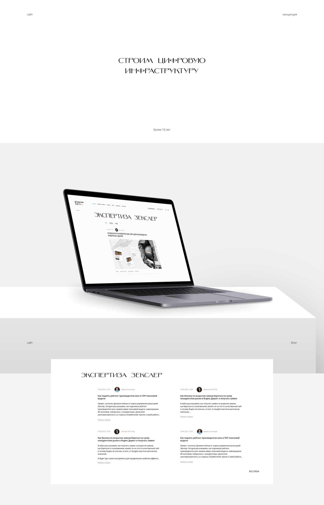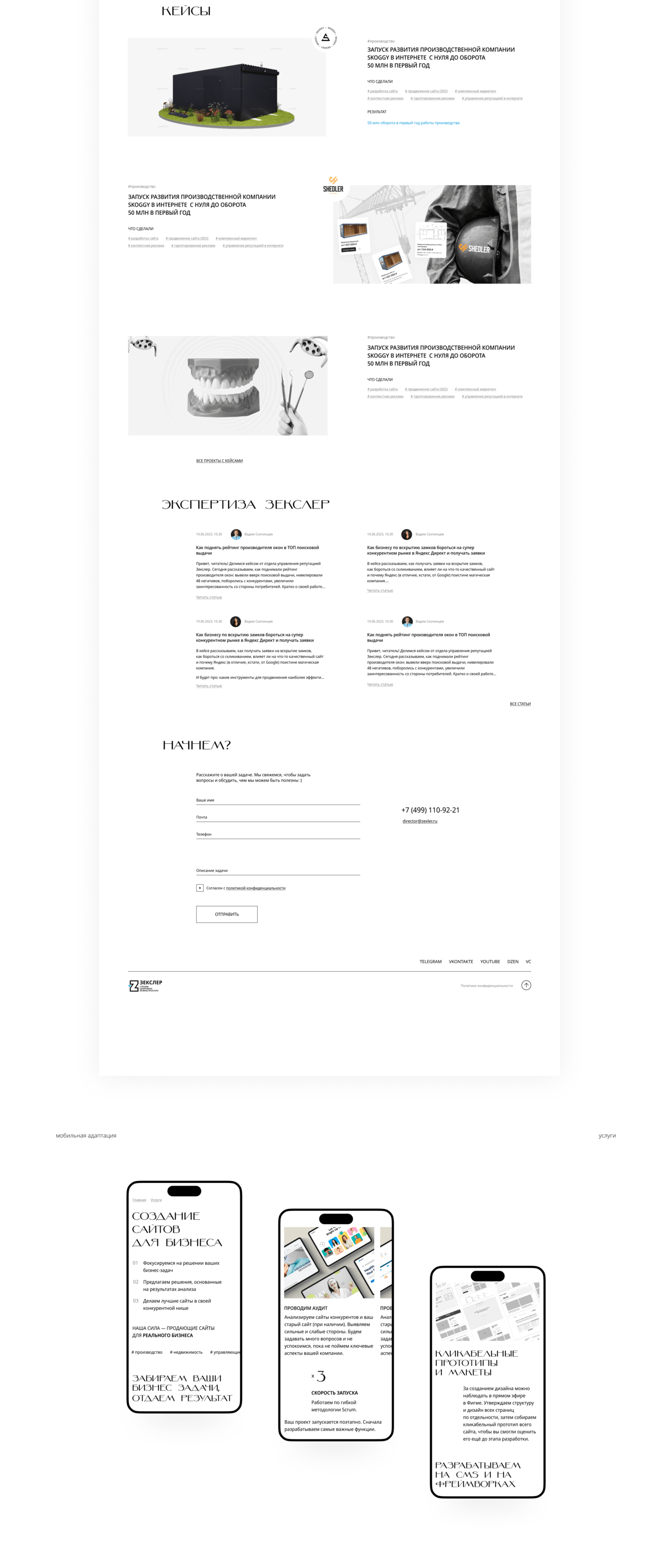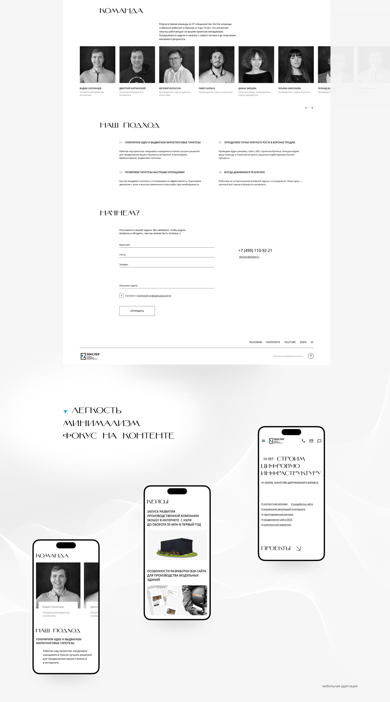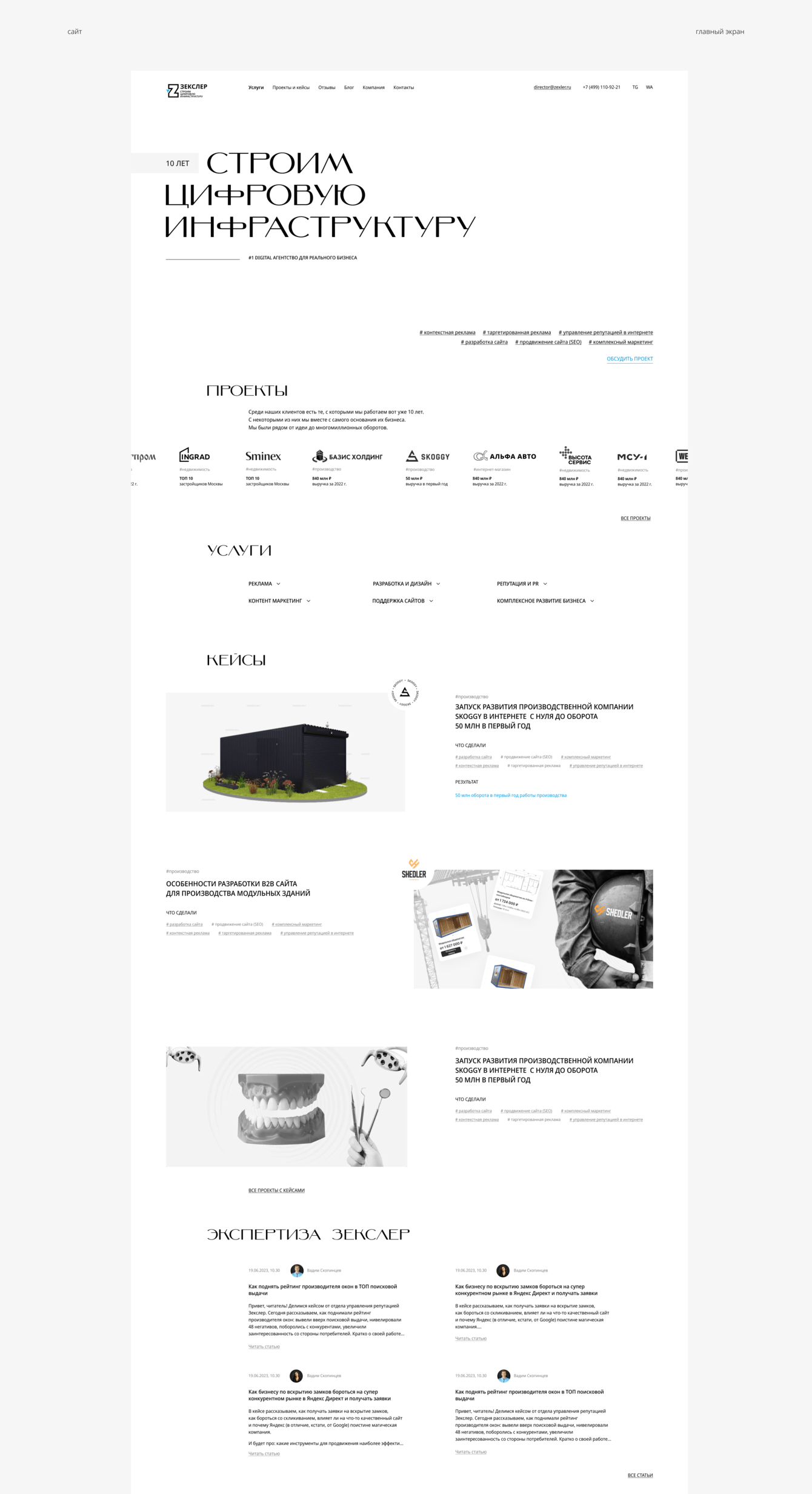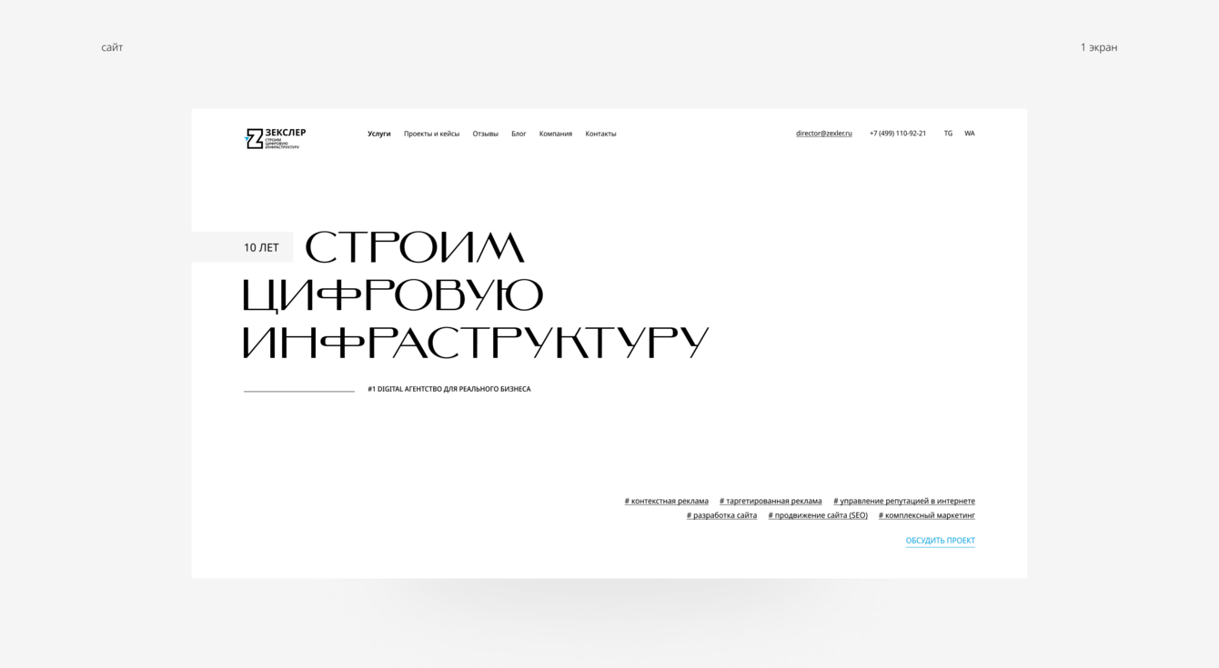 Главный посыл ЗЕКСЛЕР – комплексный подход. Мы не относим себя к дизайн-агентству или маркетинговому агентству; мы та компания, которая подходит комплексно к развитию бизнеса наших клиентов в интернете. Мы долго прорабатывали свои посылы и то, что хотим донести. И всё это старались отразить именно в контенте. То есть при разработке нового сайта был акцент не на каком-то там супер дизайне, а на донесении всех посылов о том, кто мы такие, что мы делаем, и как строим цифровую инфраструктуру в интернете для реального бизнеса. Об этом мы написали на первом экране.
