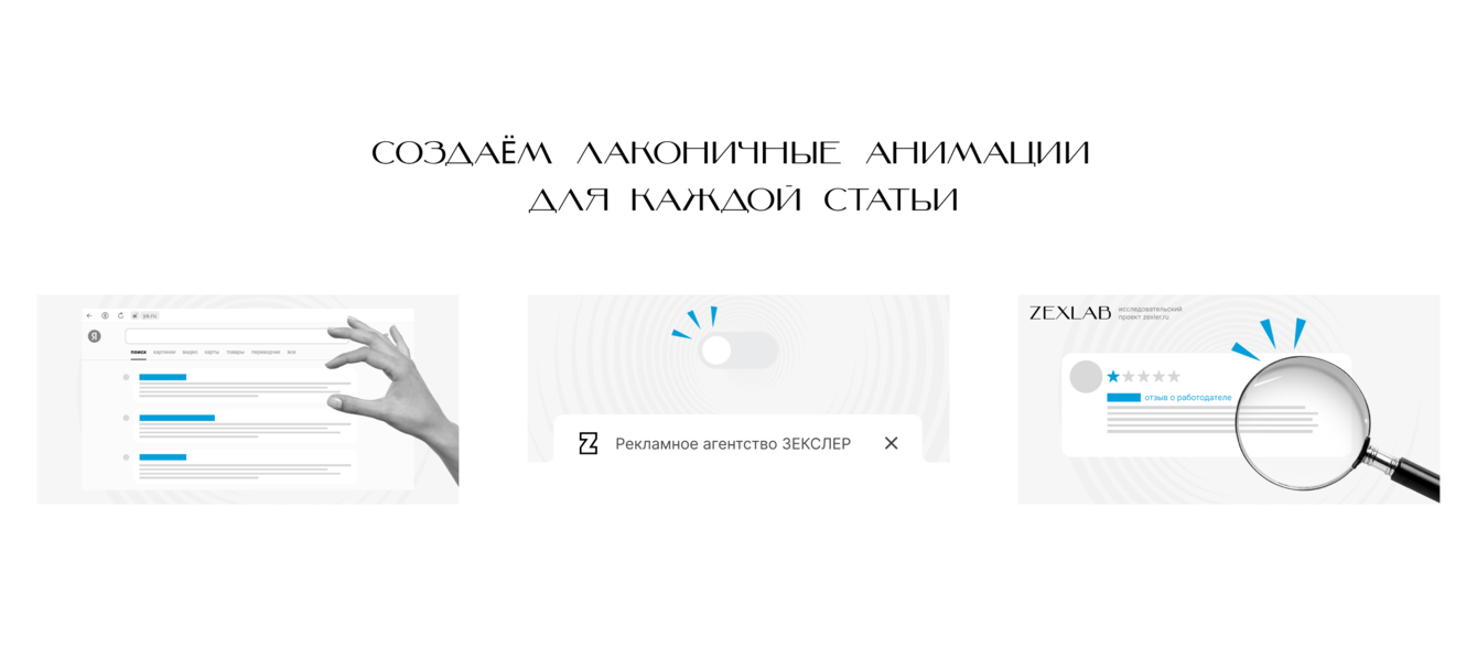 Так как мы выбрали очень минималистичный дизайн, акцент на визуале сделали с помощью небольшой анимации. К статьям делаем анимированные обложки в едином стиле. Внутри кейсов и услуг много картинок в которых делаем лёгкую анимацию. Они привлекают внимание и при этом отражают суть кейса и тематику.