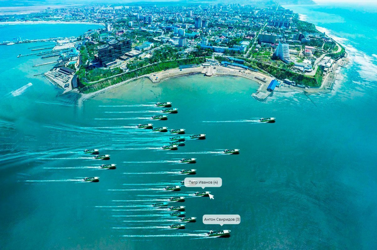 Для начала мы выбрали самый простой путь и взяли угол обзора сверху. Но, в таком случае, не решалась задача по размещению ФИО участников на борту яхты и парусе. Эту проблему мы решили с помощью баблов — всплывающих окон с ФИО участника при наведении на яхты.