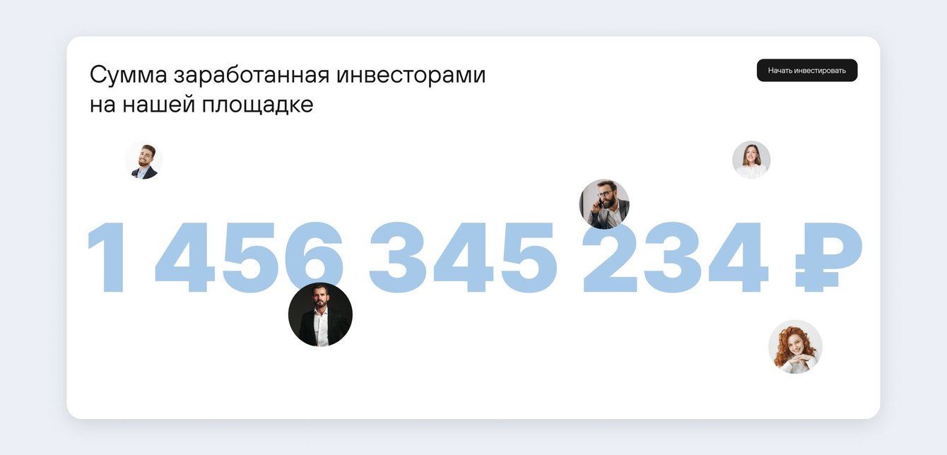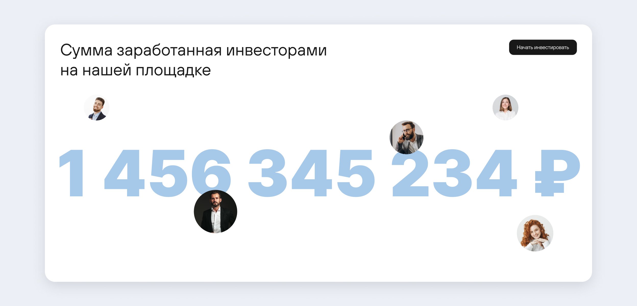 Ниже мы рассказываем о компании в цифрах: сначала пользователь увидит, сколько уже заработали инвесторы на нашей платформе, и эта цифра станет обновляться.