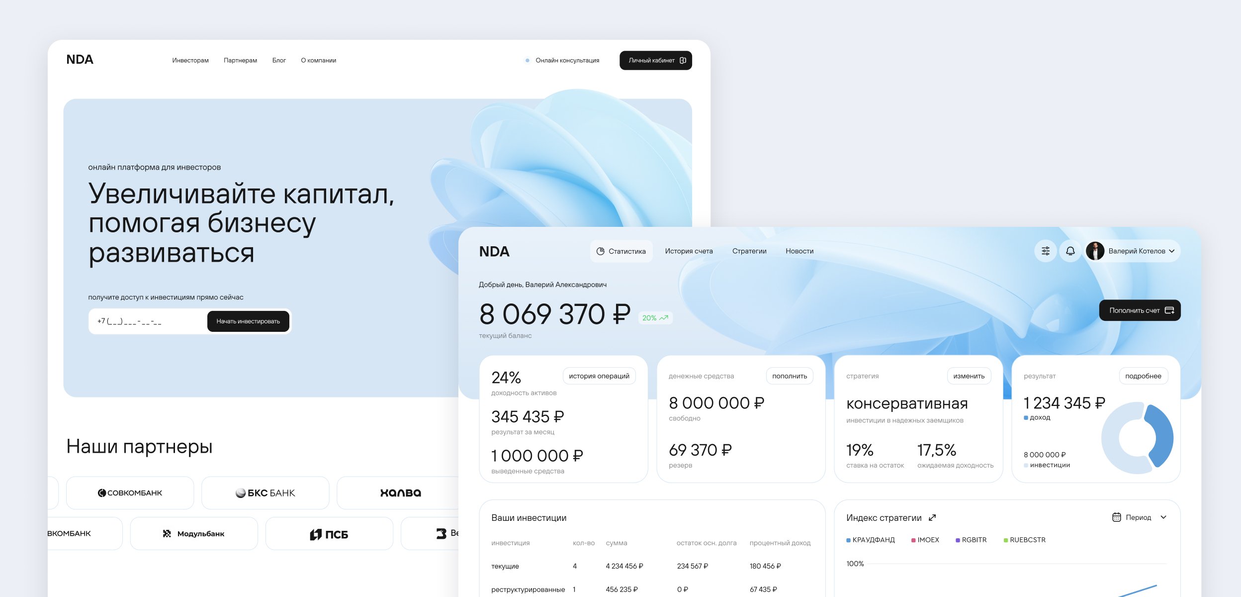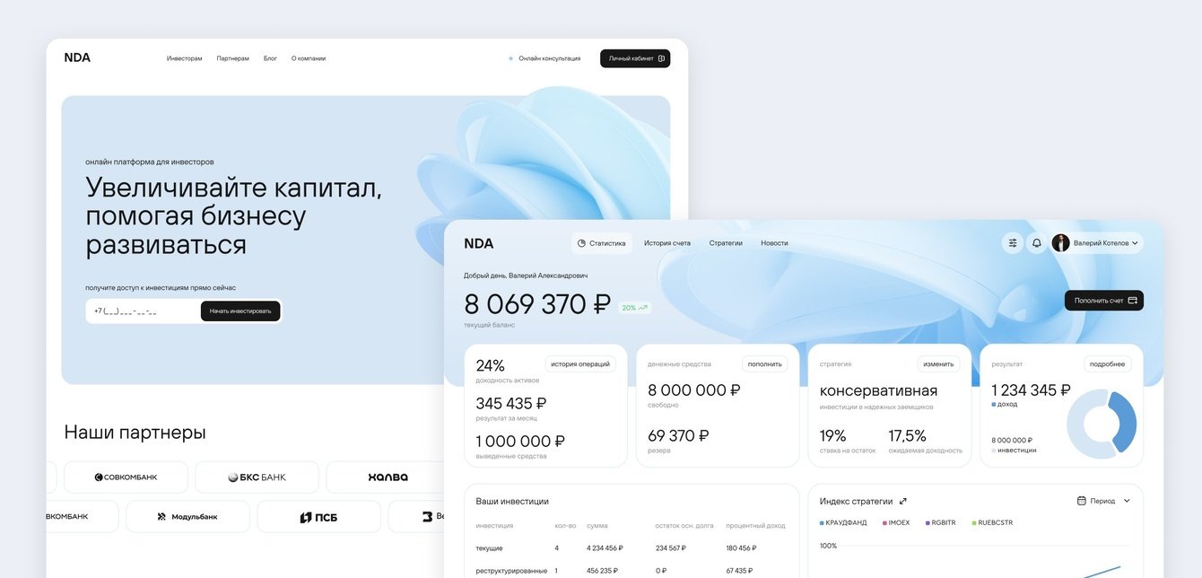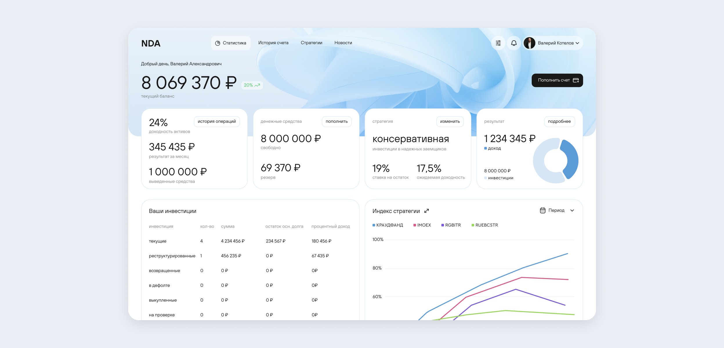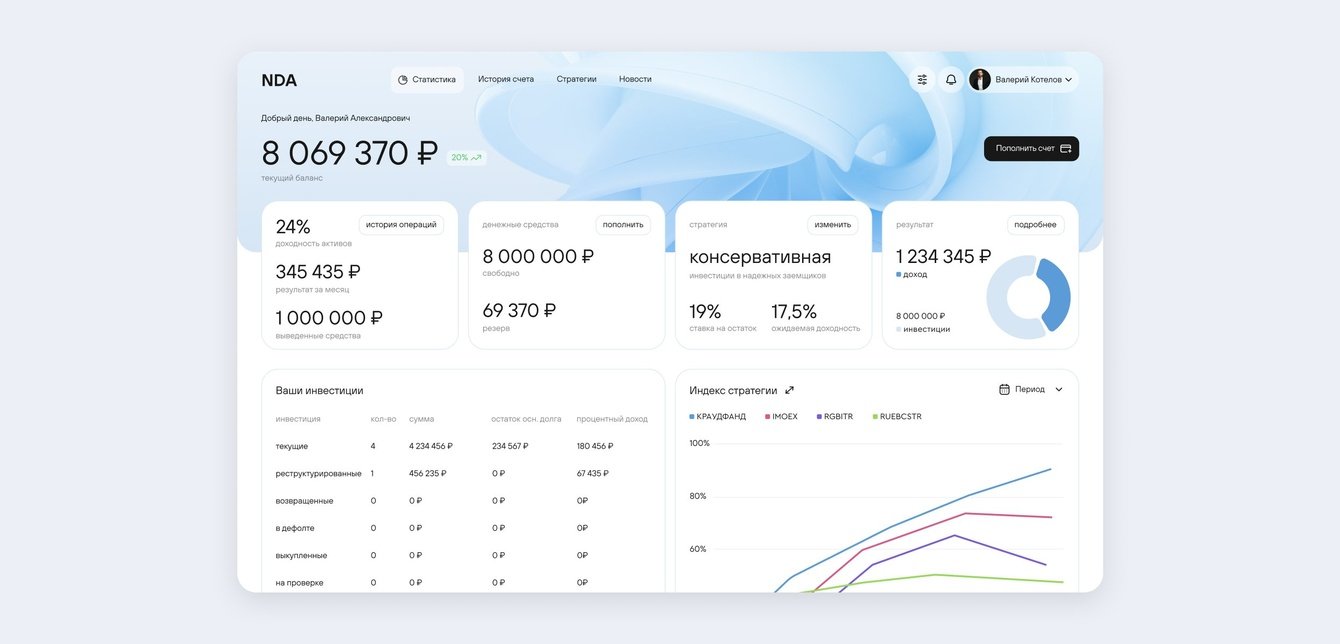 На Dashboard отображаются сумма, текущий баланс и тренд роста — сколько процентов инвестор уже заработал благодаря платформе. Также предусмотрена возможность быстрого пополнения счета.