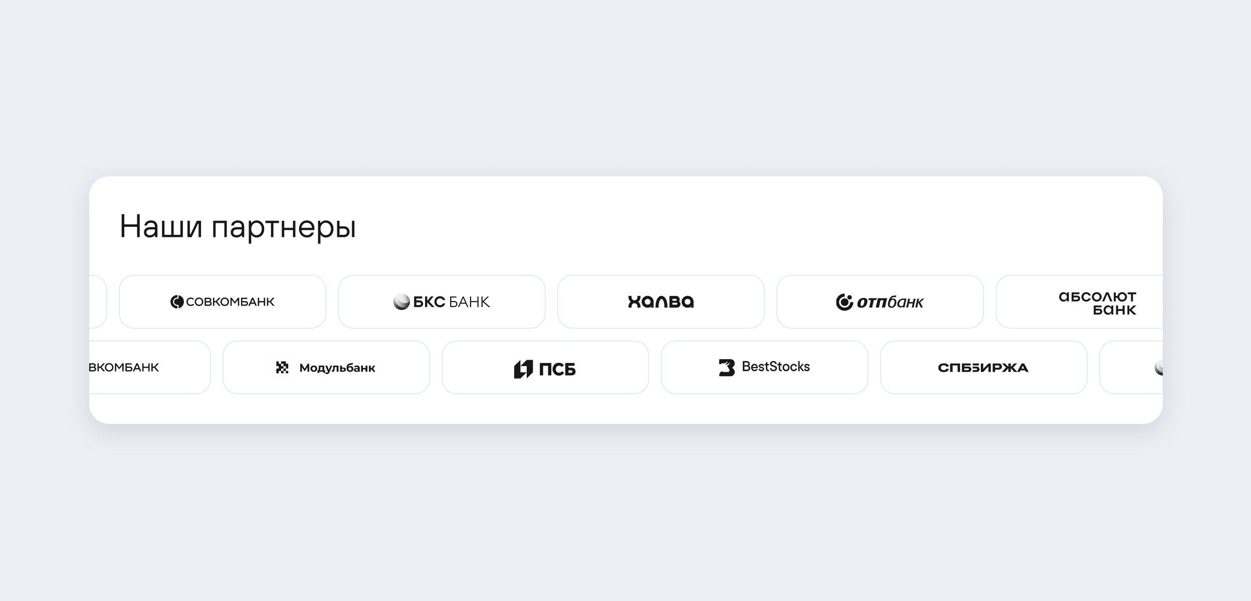 Этот раздел позволяет пользователю узнать о крупных партнерах нашей платформы, что уменьшает сомнения в надежности компании.