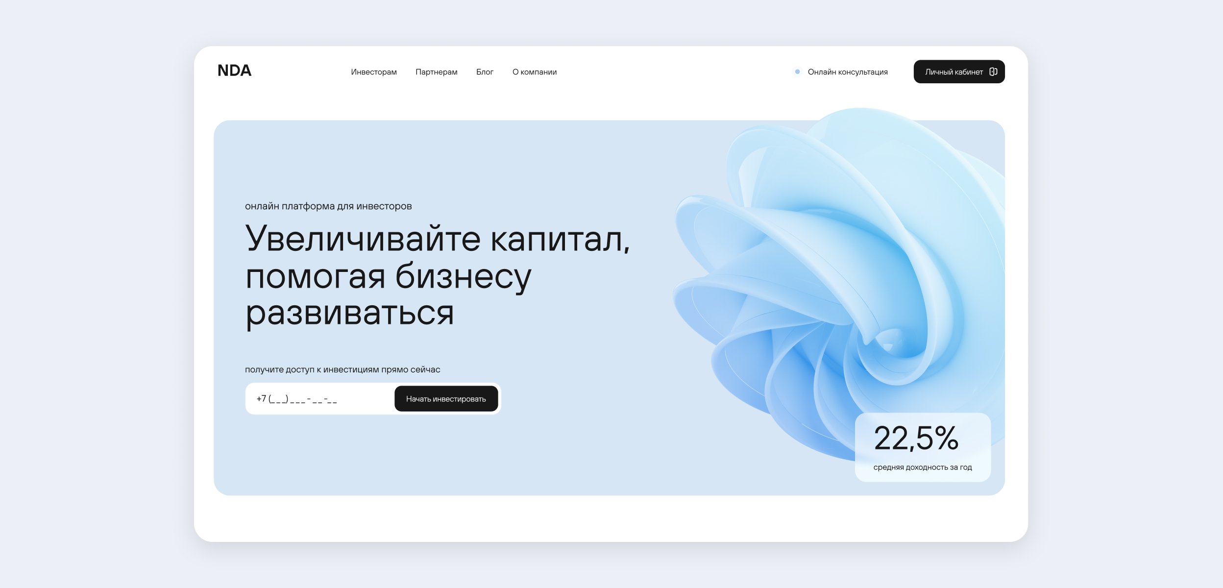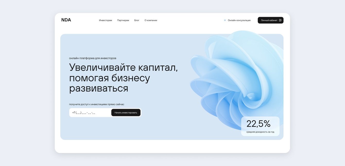 Справа размещена абстрактная 3D-иллюстрация, которую можно анимировать. Также есть промоблок, в котором показывается средняя доходность инвесторов за год.