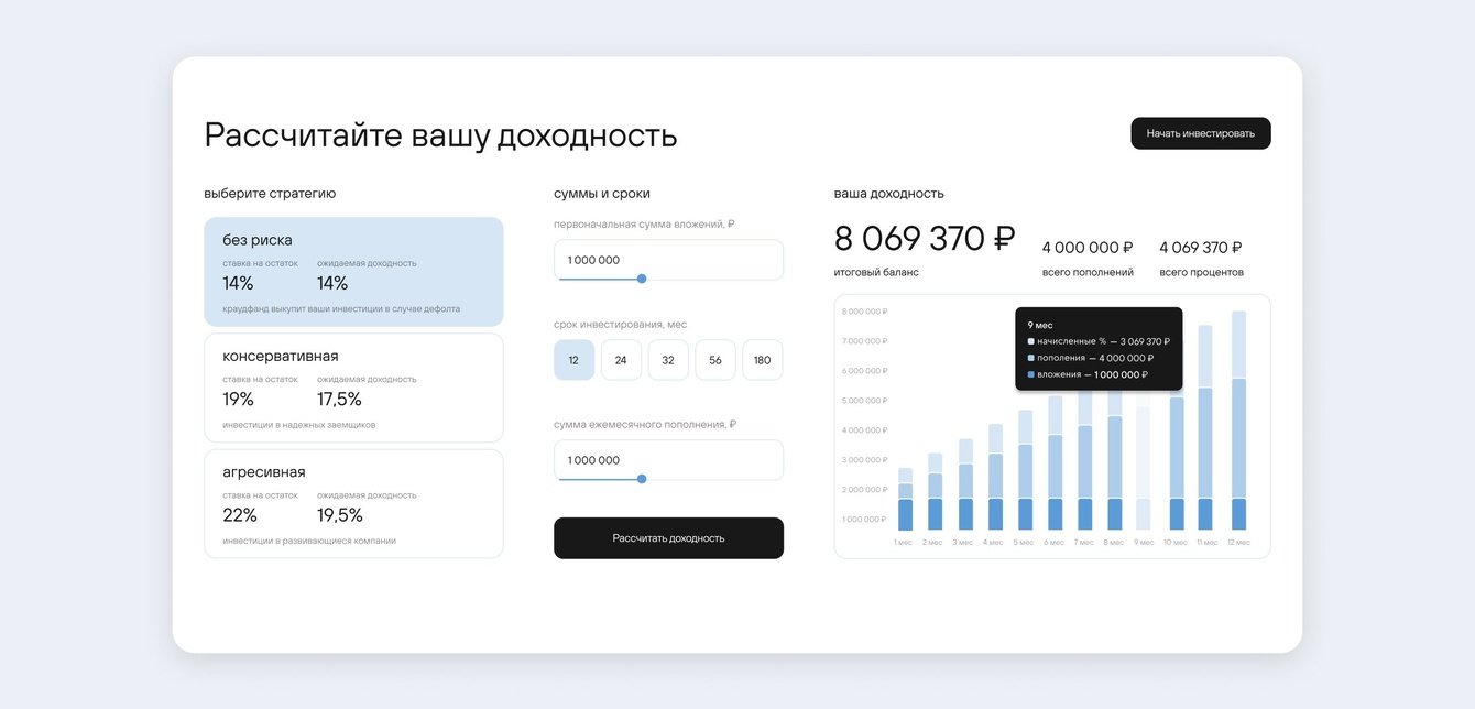 Блок позволяет узнать инвестору, какую доходность он получит. Здесь можно выбрать стратегию, указать сумму и срок инвестирования, а затем сразу увидеть приблизительную доходность и изучить синографик по росту капитала от месяца к месяцу.