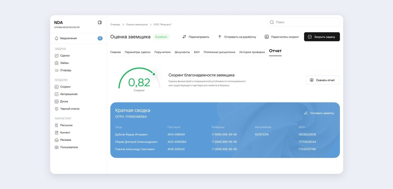 Сотрудник отдела безопасности открывает вкладку «Отчет» и сразу видит скоринг благонадежности заемщика. Отчет можно скачать в любом нужном формате.