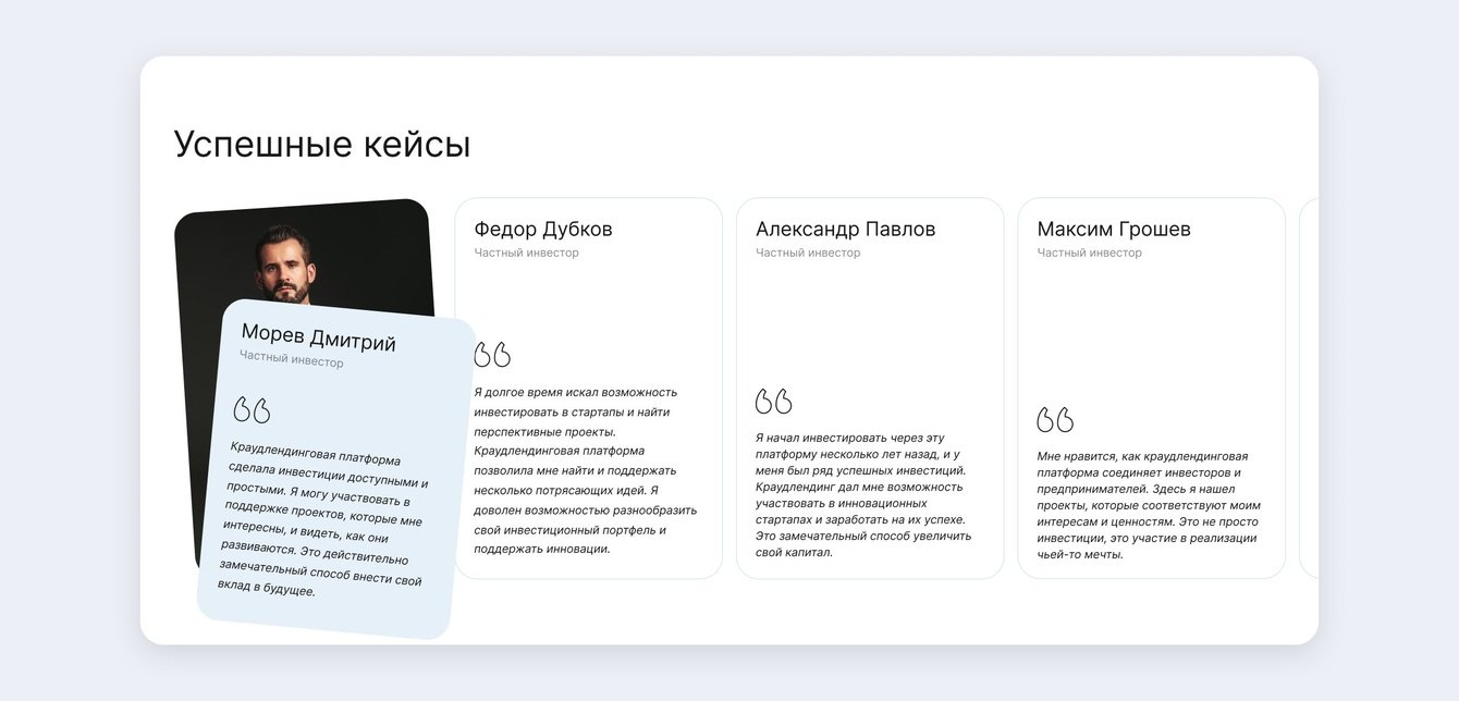 Этот блок показывает, как текущие пользователи уже взаимодействуют с платформой и какие проблемы были решены благодаря ней. Мы показываем реальные примеры успеха, чтобы продемонстрировать эффективность платформы и повысить доверие.