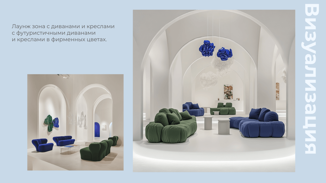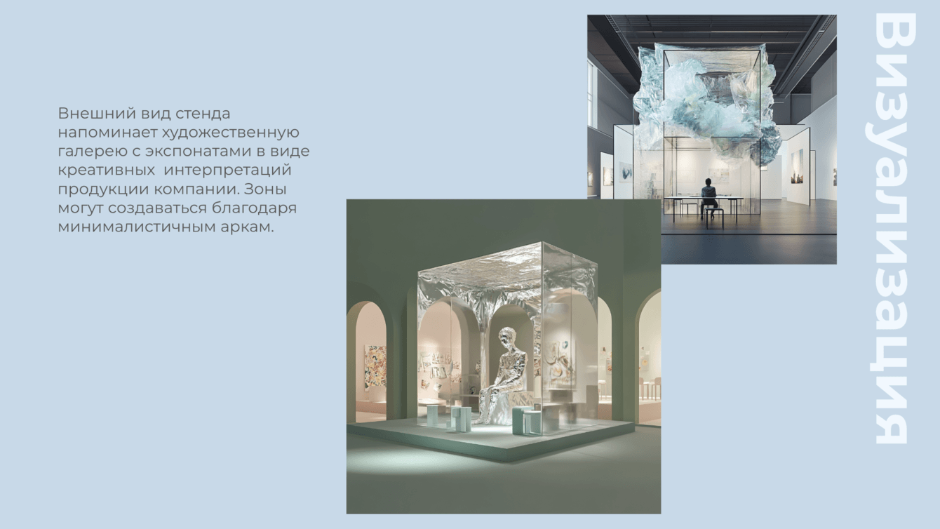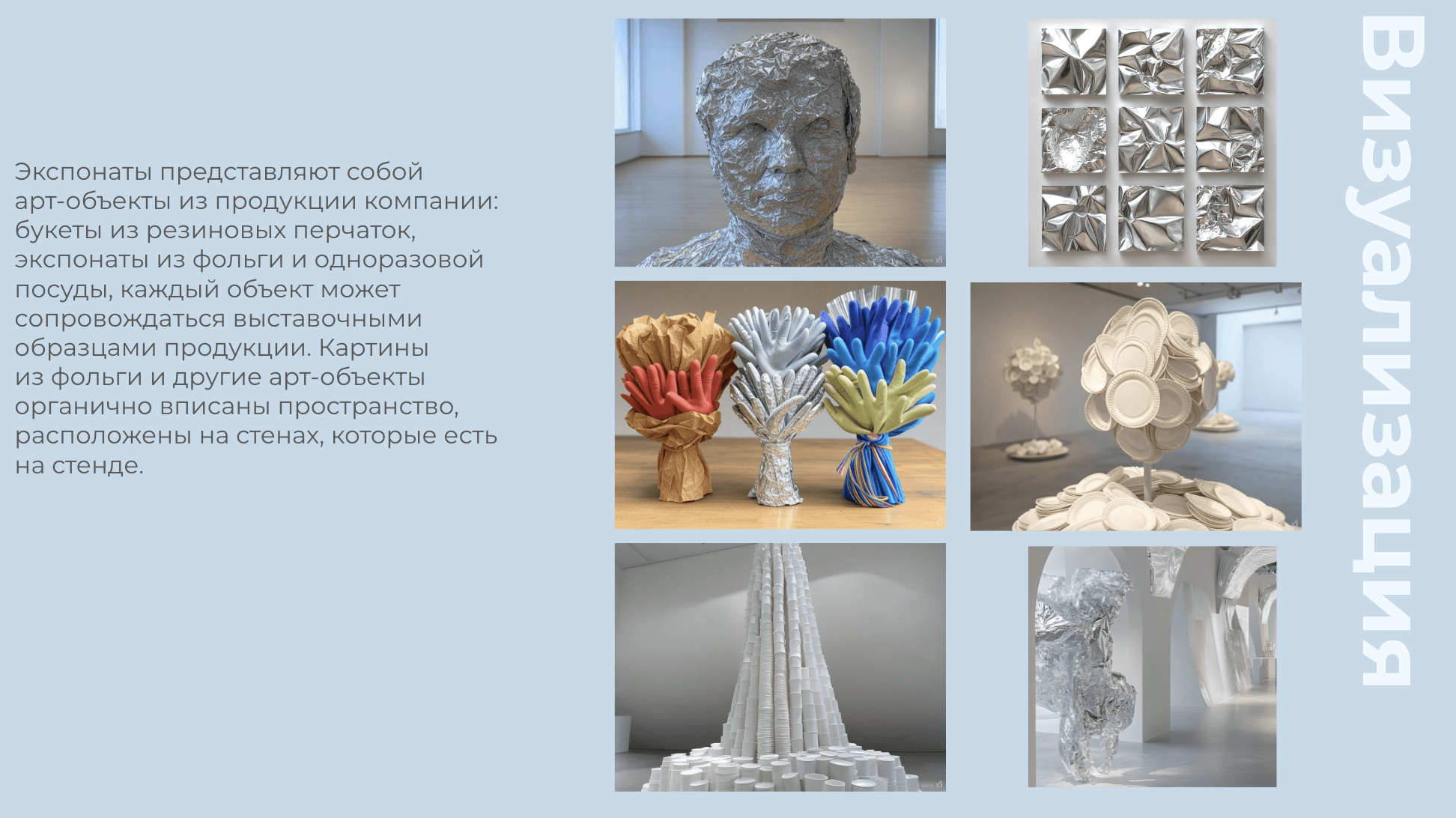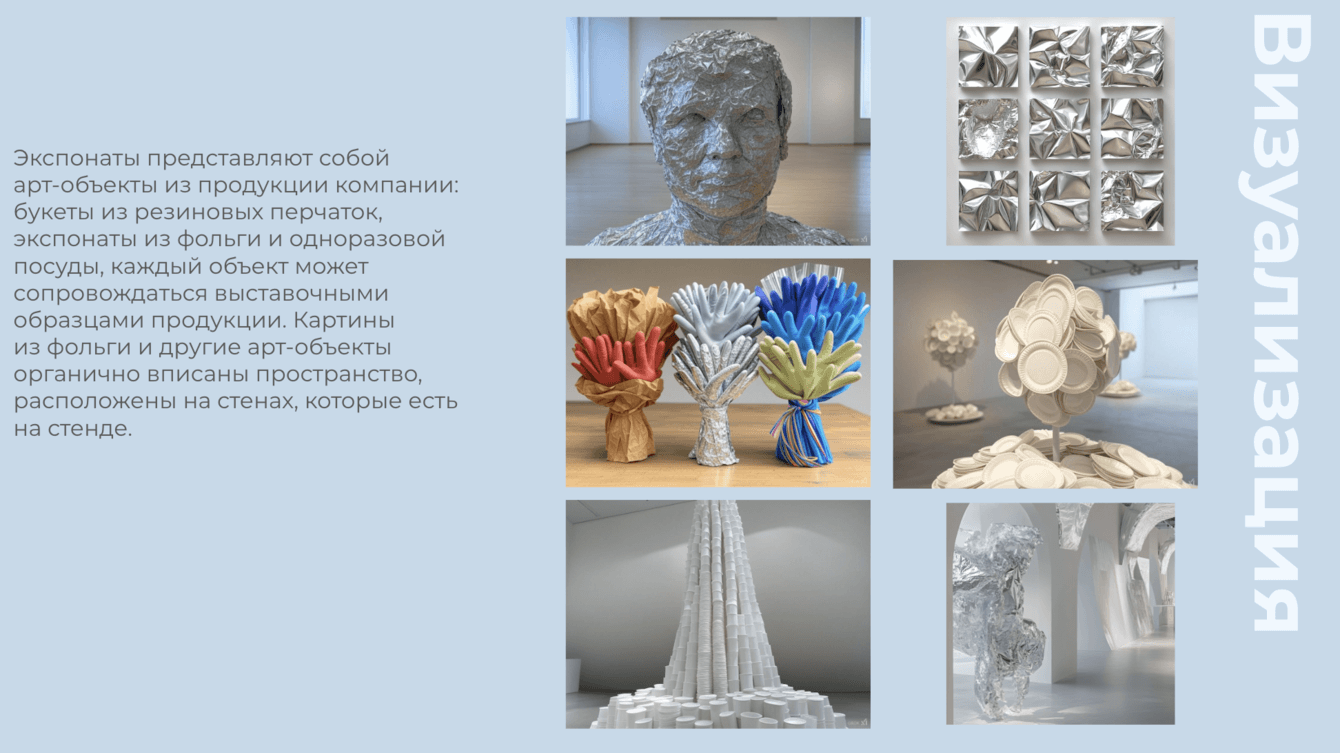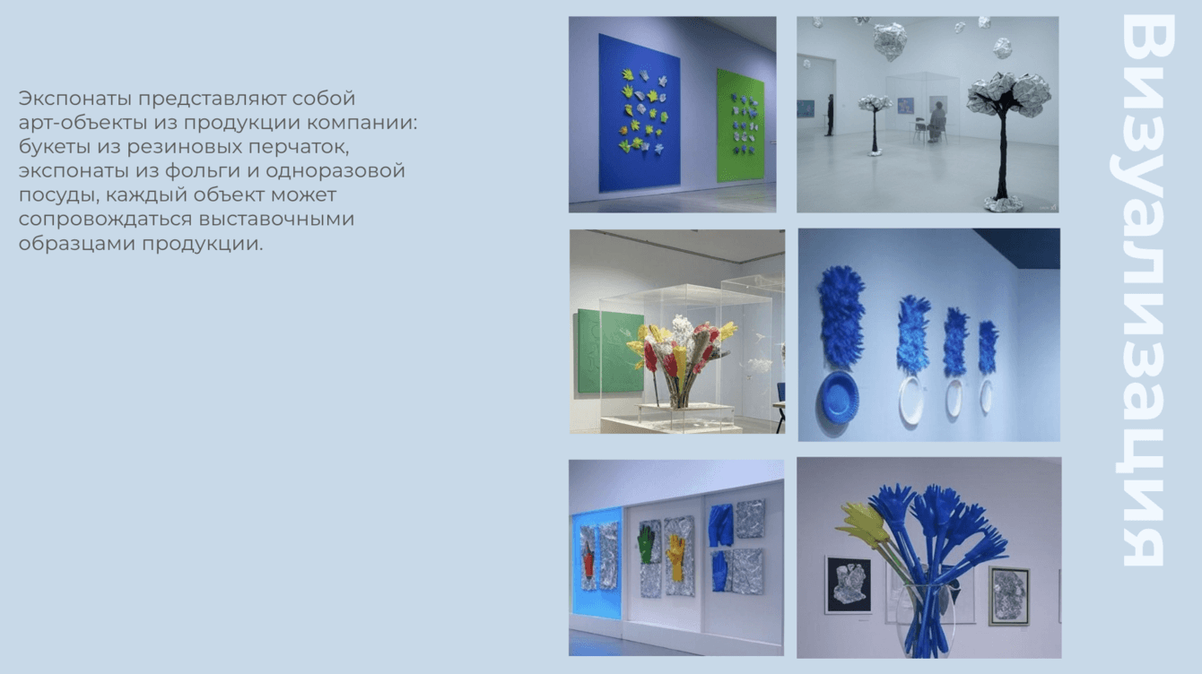 Пространство выполнено в формате художественной галереи. Белые стены с акцентами зеленого и синего цветов, минималистичный дизайн и подчёркнутая театральность экспонатов создают ощущение настоящего музея. По внутри арт-объекты из продукции компании: букеты из резиновых перчаток, картины из помятой фольги, виды одноразовой посуды.