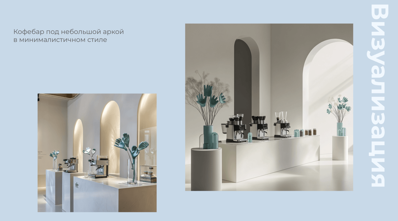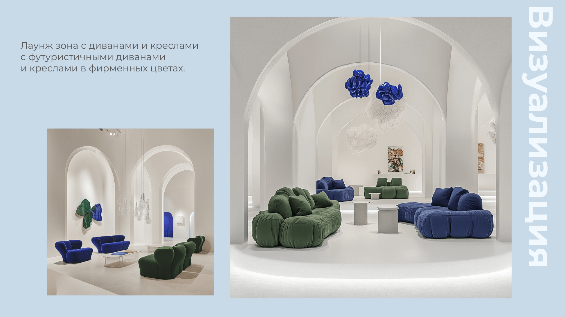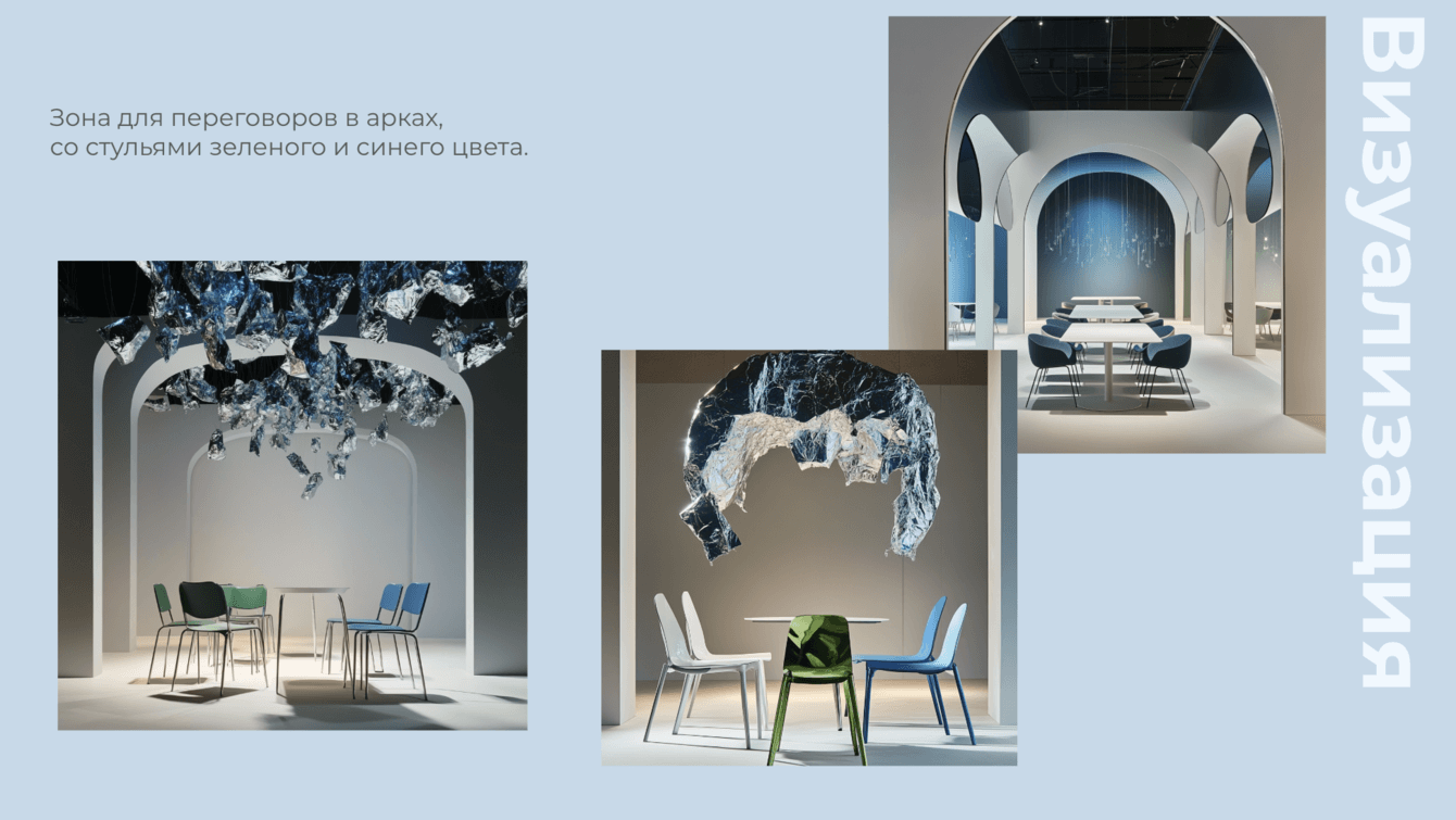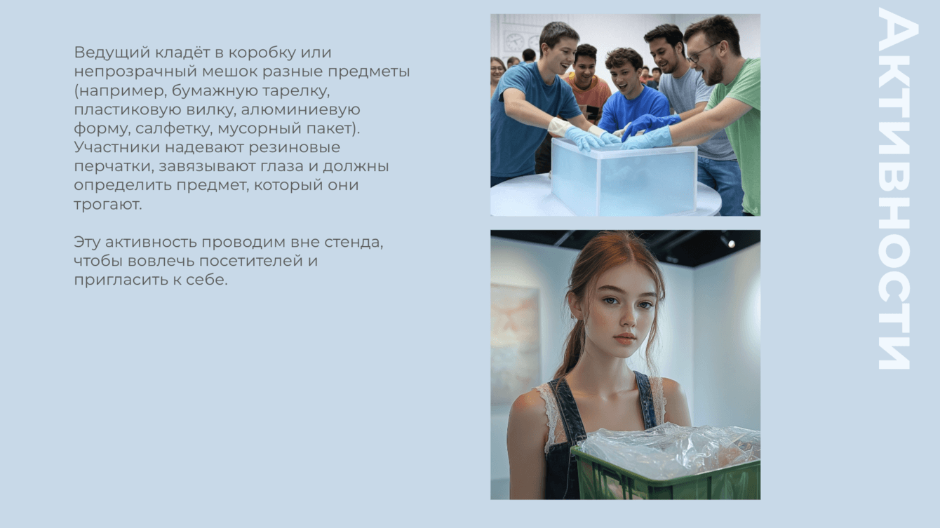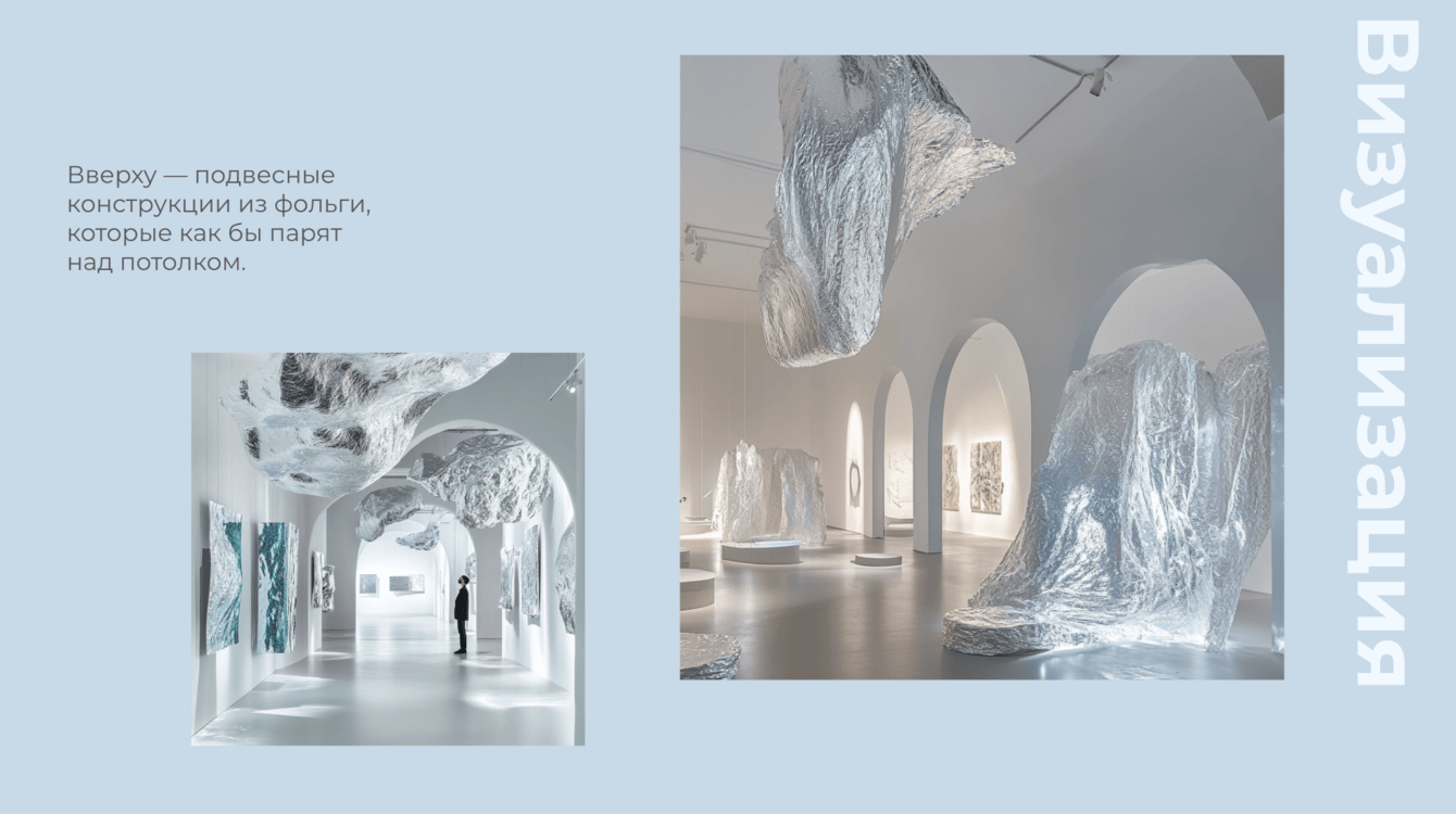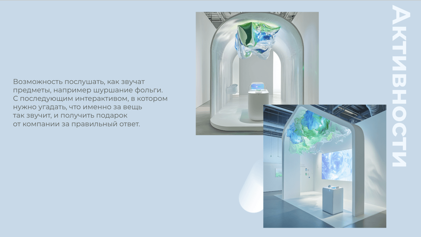 Пространство выполнено в формате художественной галереи. Белые стены с акцентами зеленого и синего цветов, минималистичный дизайн и подчёркнутая театральность экспонатов создают ощущение настоящего музея. По внутри арт-объекты из продукции компании: букеты из резиновых перчаток, картины из помятой фольги, виды одноразовой посуды.