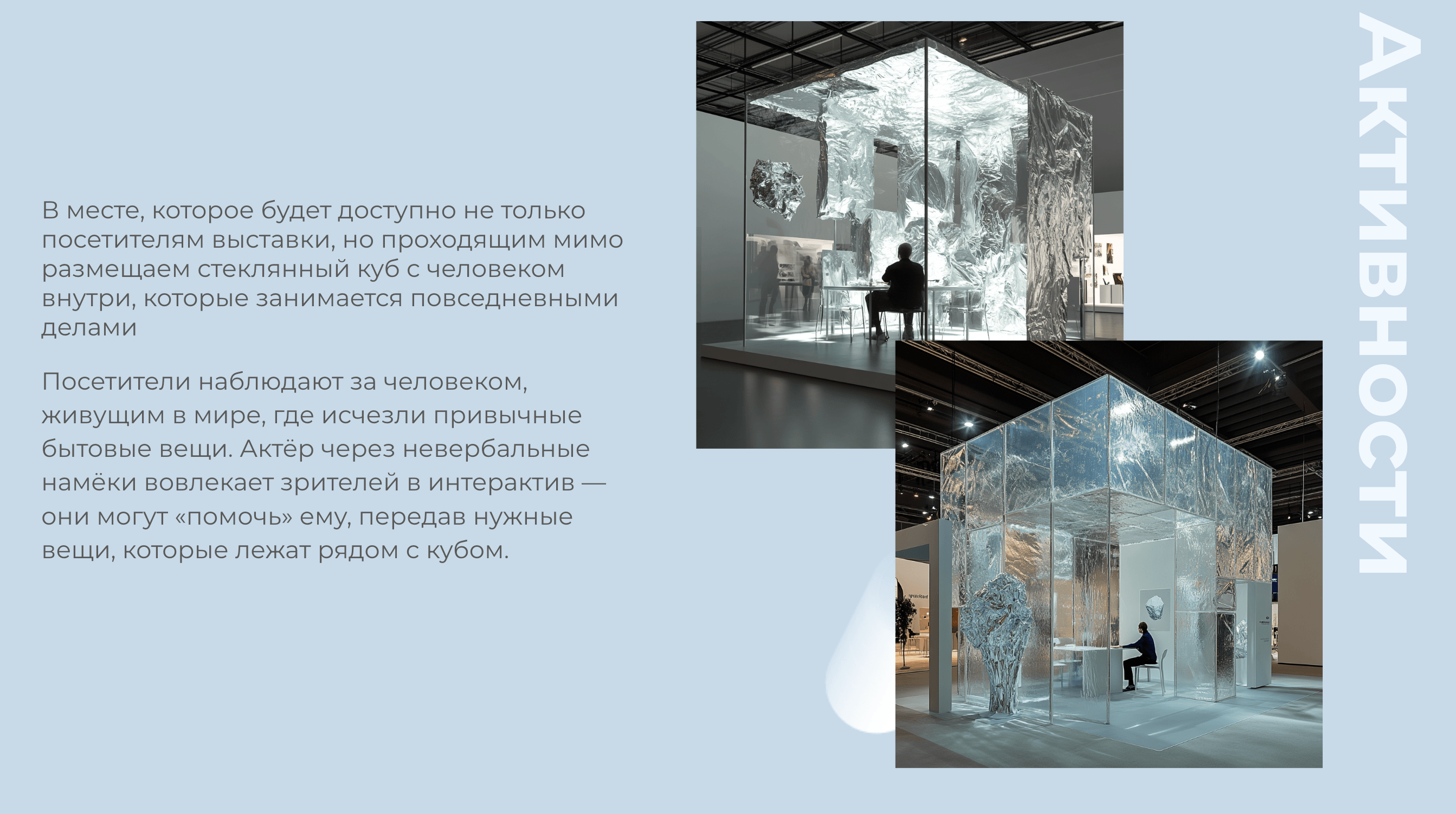 А у входа стоит стеклянный куб, в котором живёт человек. Это обычный человек, который просто пытается справляться с повседневными задачами — и терпит неудачу.