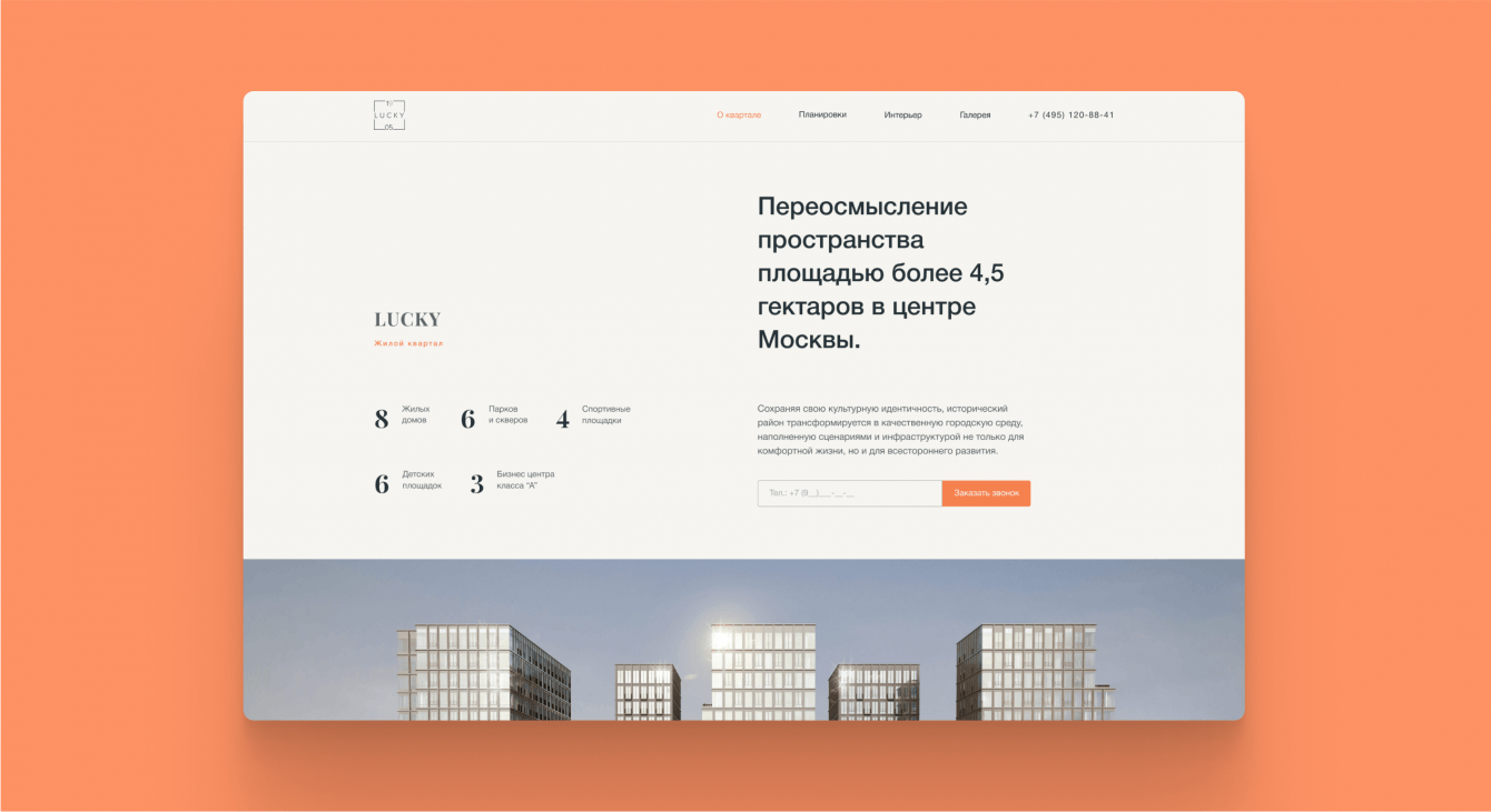 ЖК «Lucky» – объект агентства элитной недвижимости Choice Estate. Мы сотрудничаем с Choice Estate давно, поэтому разработку landing page для своего нового объекта они доверили именно нам. Так как у нас есть опыт работы с сегментом элитной недвижимости, мы действовали, ориентируясь на те ценности, которые важны для потенциальных клиентов: уникальность, комфорт и премиальность. Результатом работы нашей команды стал лендинг, дизайн которого визуально минималистичный, информативный, «ничего лишнего».
