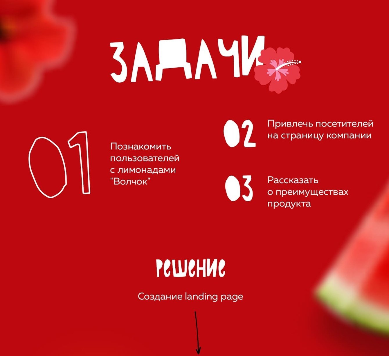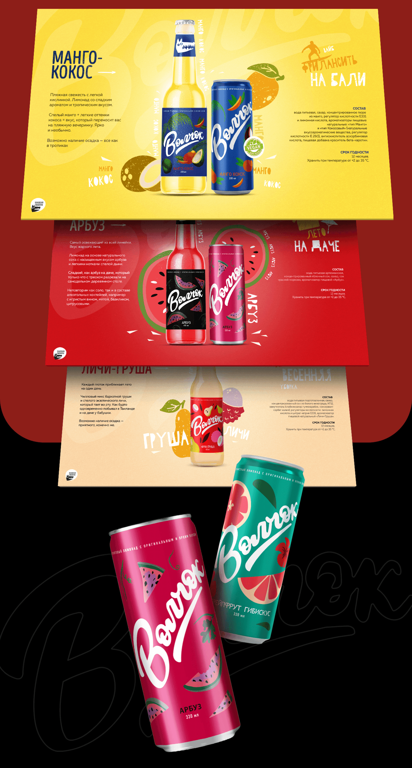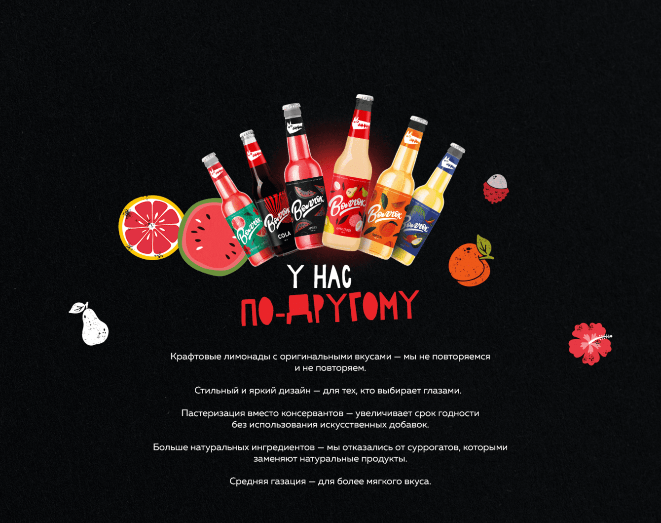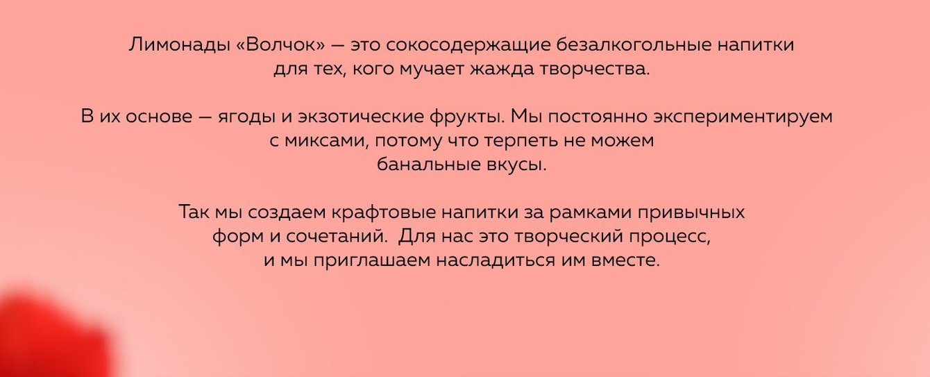 В ходе работы мы оперативно обменивались обратной связью, которая была экологичной и понятной. Это позволило нам закрыть обе задачи в минимальные сроки. В процессе разработки лендинга и презентации о продукте мы нашли отличный баланс между креативностью и информативностью. Клиент был открыт к нашим идеям и предложениям, что позволило нам создать привлекательный дизайн, который отражает уникальность и качество лимонадов "Волчок".