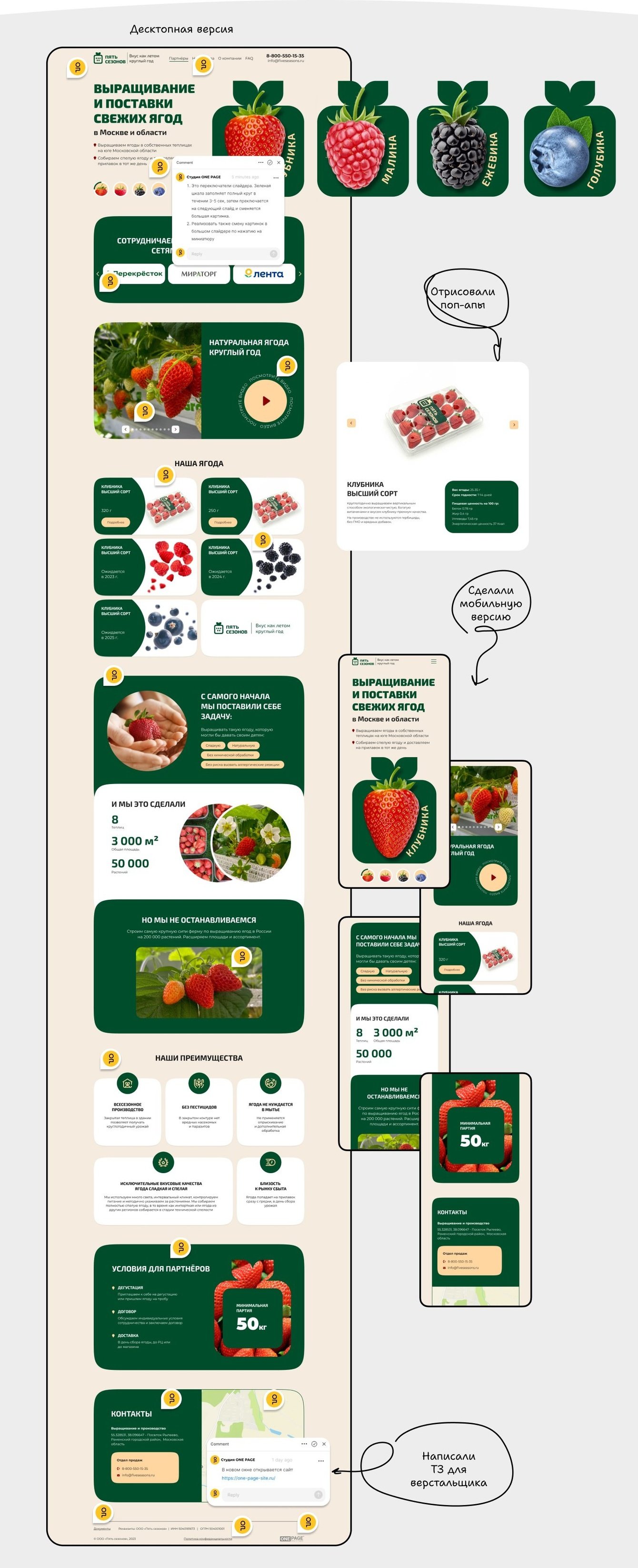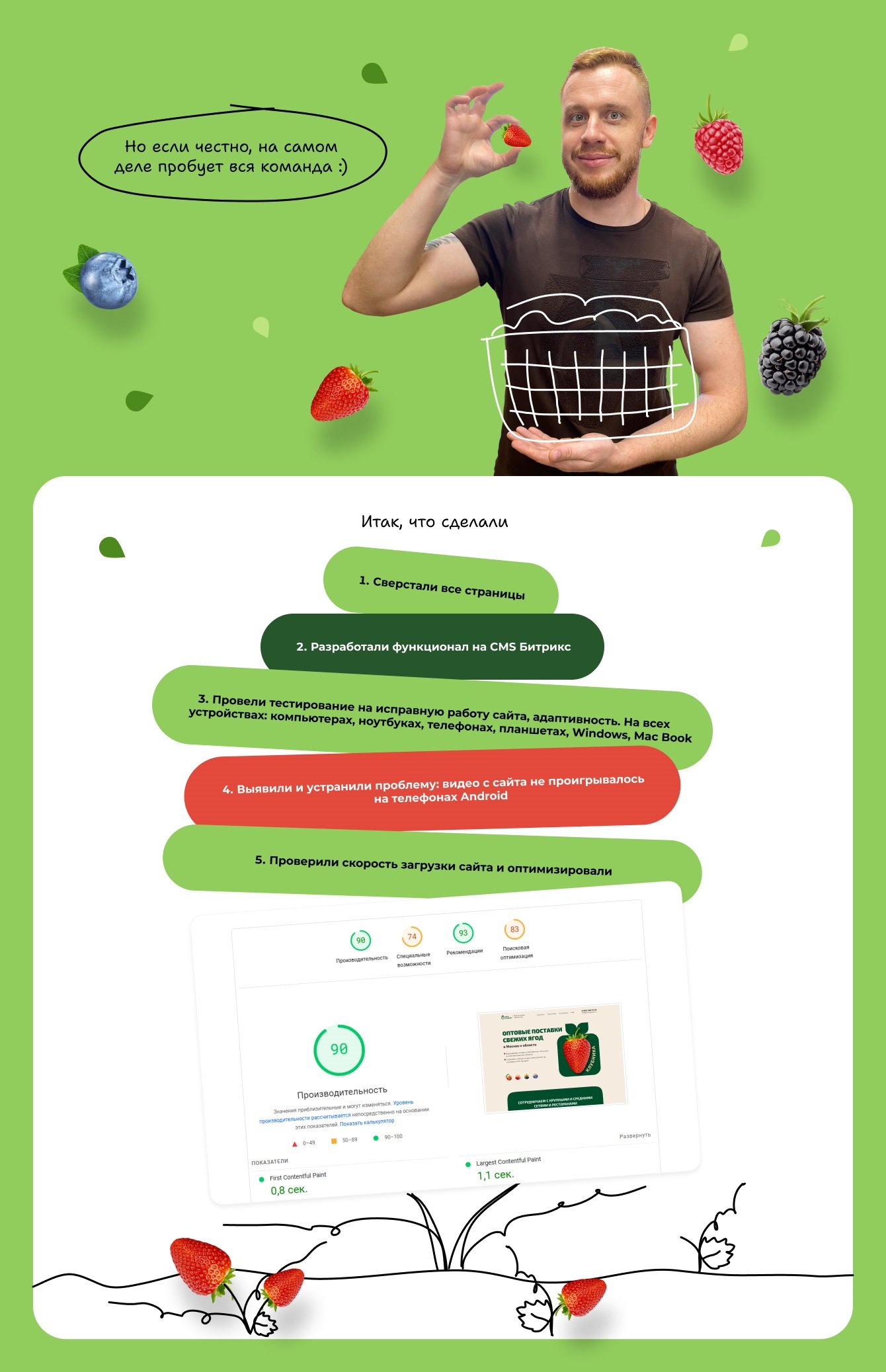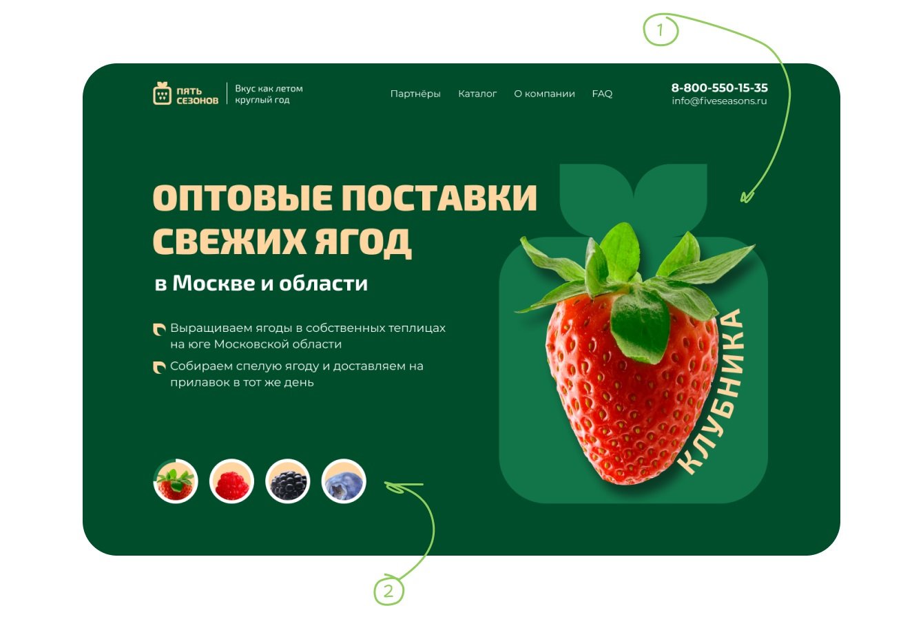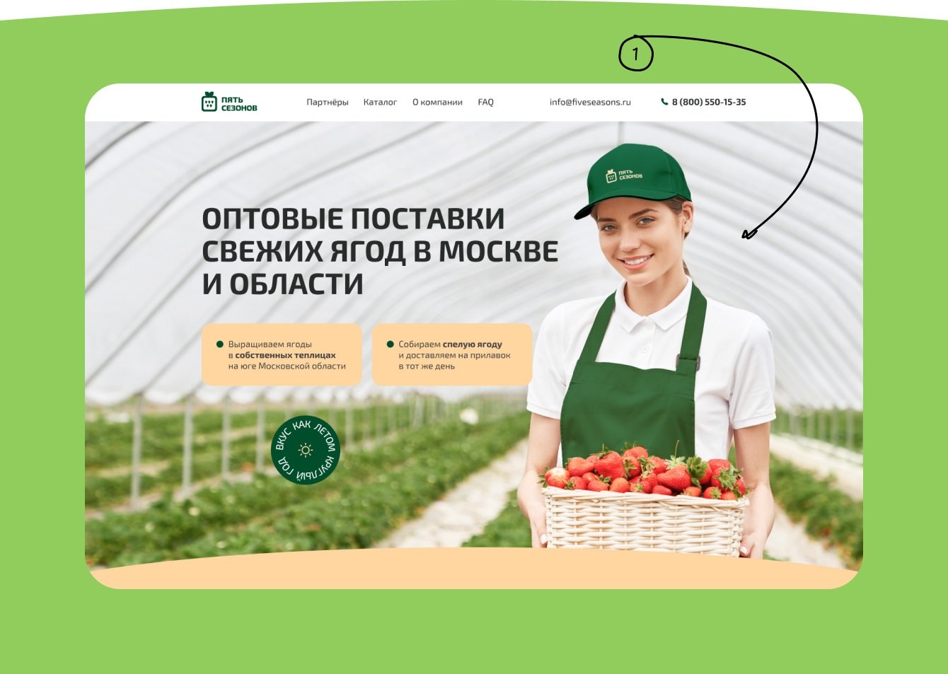 Более классическая. Сделали акцент не только на продукции, но и показали масштаб производства — теплицы и готовый урожай. Так родилась девушка с клубникой на главном экране.