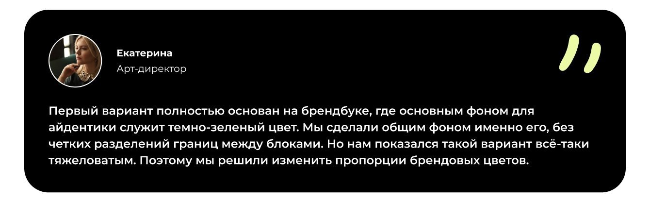 Основой служил теперь светло-бежевый цвет, а темно-зеленый выполнял роль акцентного, так концентрация внимания на каждом блоке усилилась.